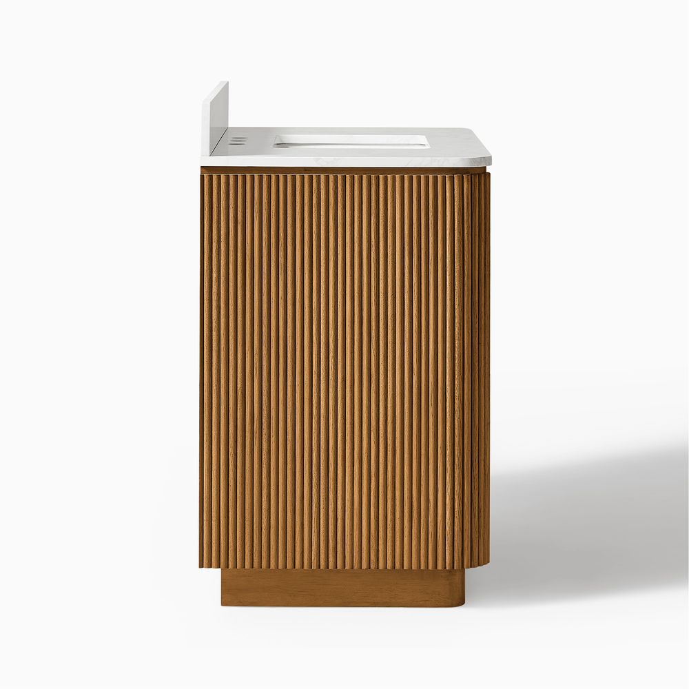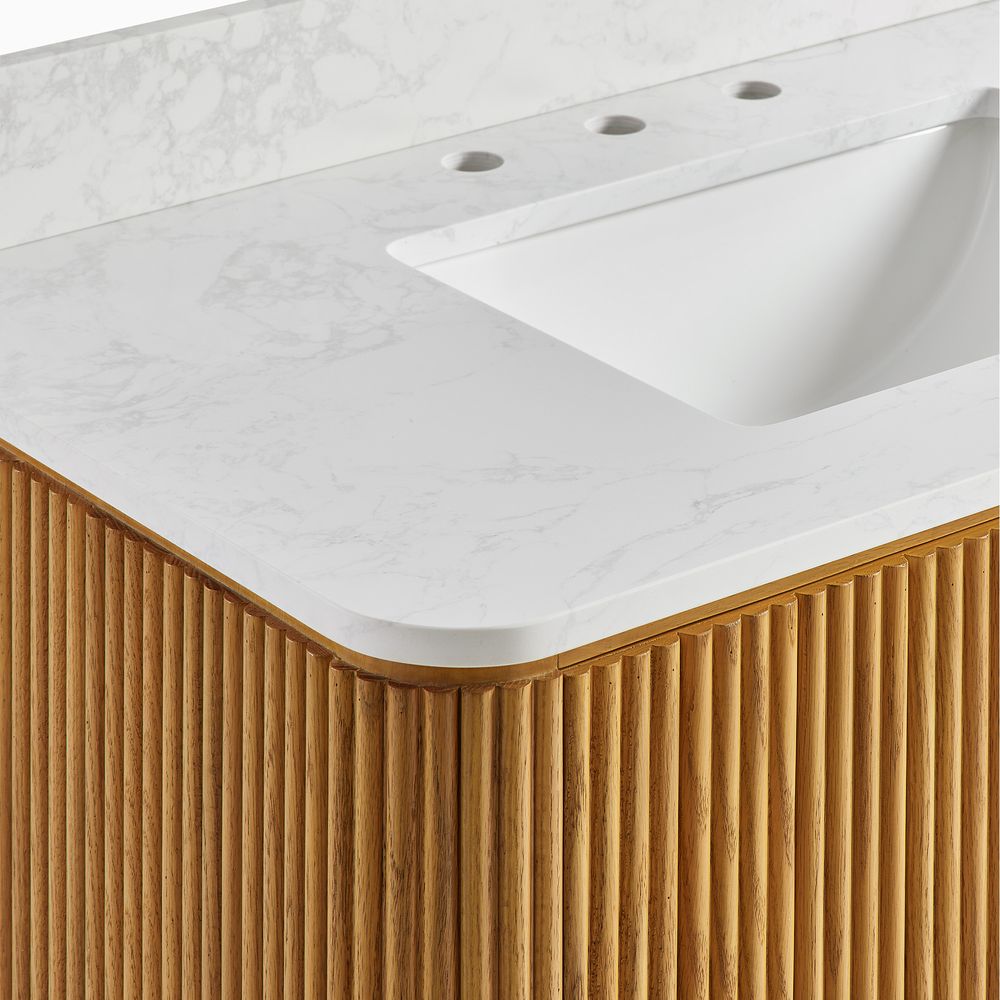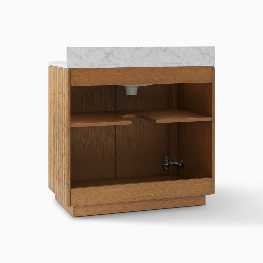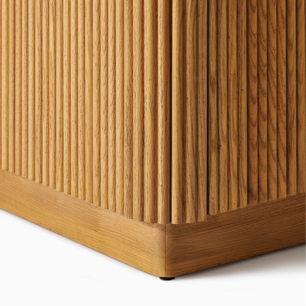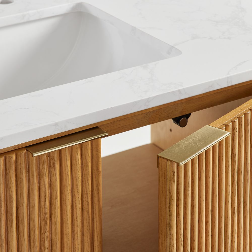 Crafted of engineered stone, American solid oak, and plywood with oak veneers.Countertop and backsplash are honed and sealed for a satin finish with deep veining and natural color contrasts.Finish is achieved through multistep process in which wood is wire brushed to highlight its rich grain.Wood glazing adds visual interest with greater depth and layering and enhances coloring.All wood is kiln-dried for added durability.Solid wood blocks are used at structural joints for reinforcement.Solid oak fluting presents a natural texture.Golden handles against the panel as focal points.Color perception may vary due to wood characteristics, lighting, and devices. Wood grain variation is expected, as each is unique.Variation in the veining of stone is to be expected, as each piece will be unique.