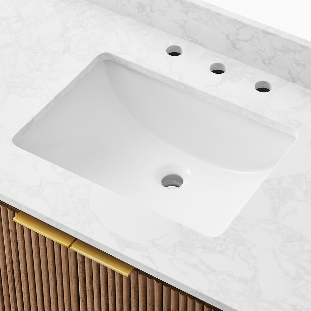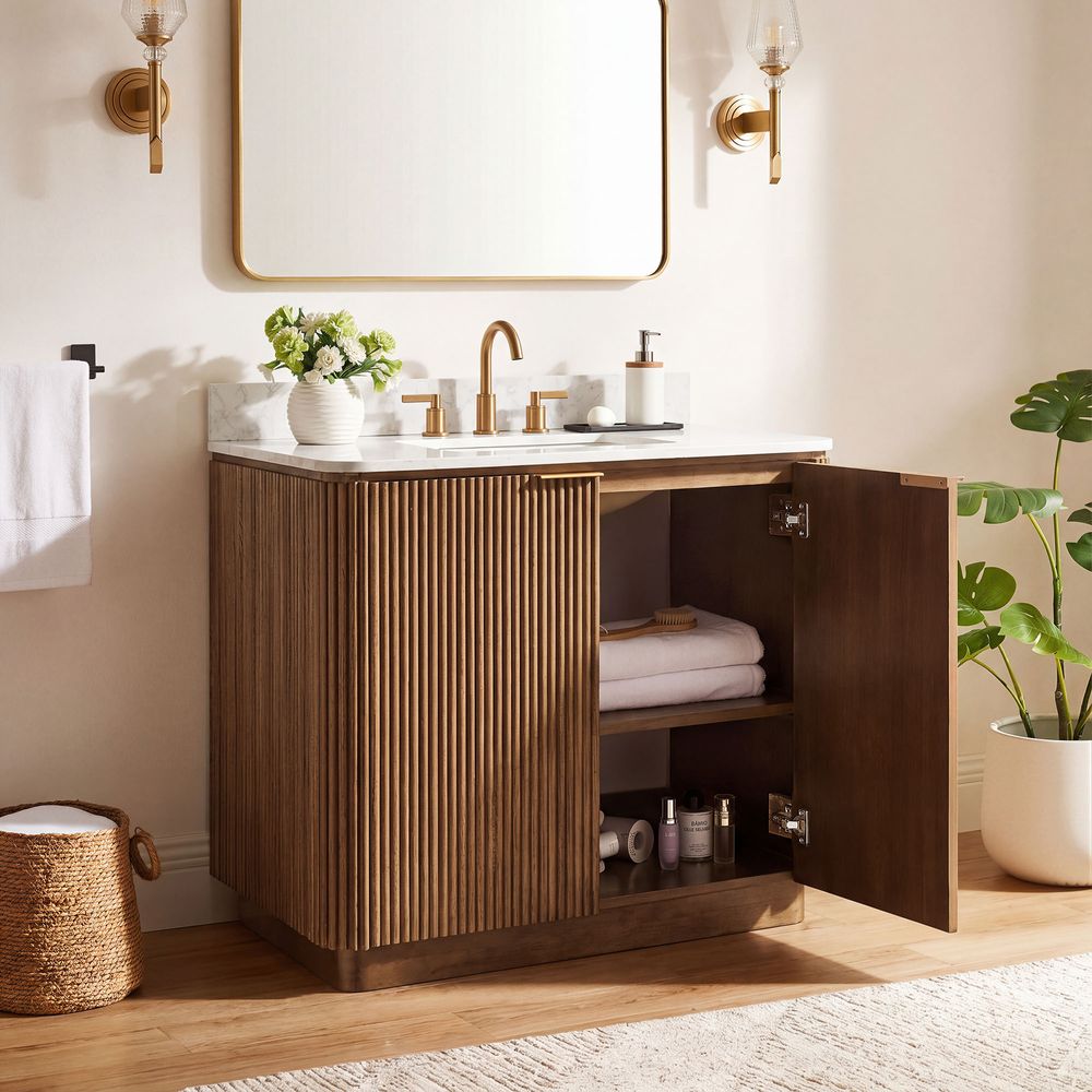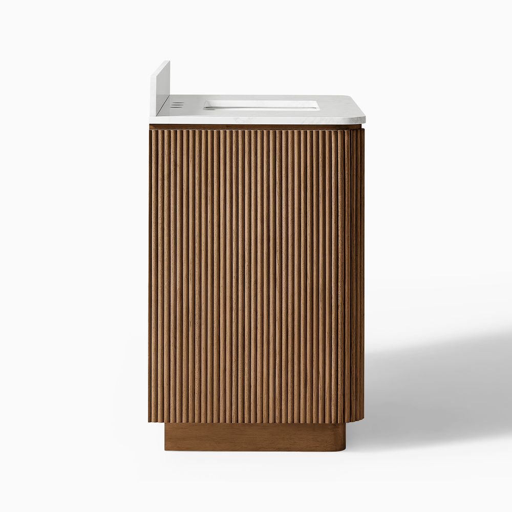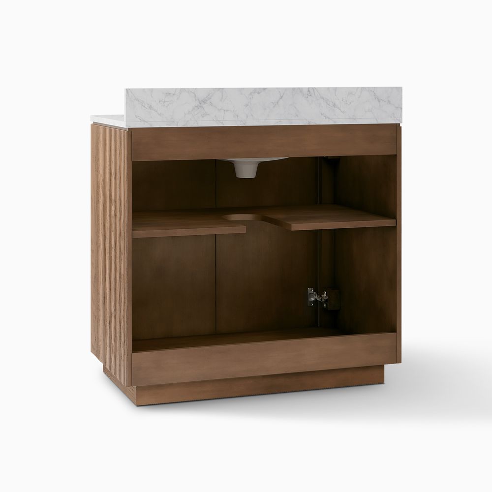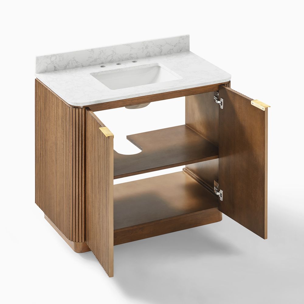Crafted of engineered stone, American solid oak, and plywood with oak veneers.Countertop and backsplash are honed and sealed for a satin finish with deep veining and natural color contrasts.Finish is achieved through multistep process in which wood is wire brushed to highlight its rich grain.Wood glazing adds visual interest with greater depth and layering and enhances coloring.All wood is kiln-dried for added durability.Solid wood blocks are used at structural joints for reinforcement.Solid oak fluting presents a natural texture.Golden handles against the panel as focal points.Color perception may vary due to wood characteristics, lighting, and devices. Wood grain variation is expected, as each is unique.Variation in the veining of stone is to be expected, as each piece will be unique.