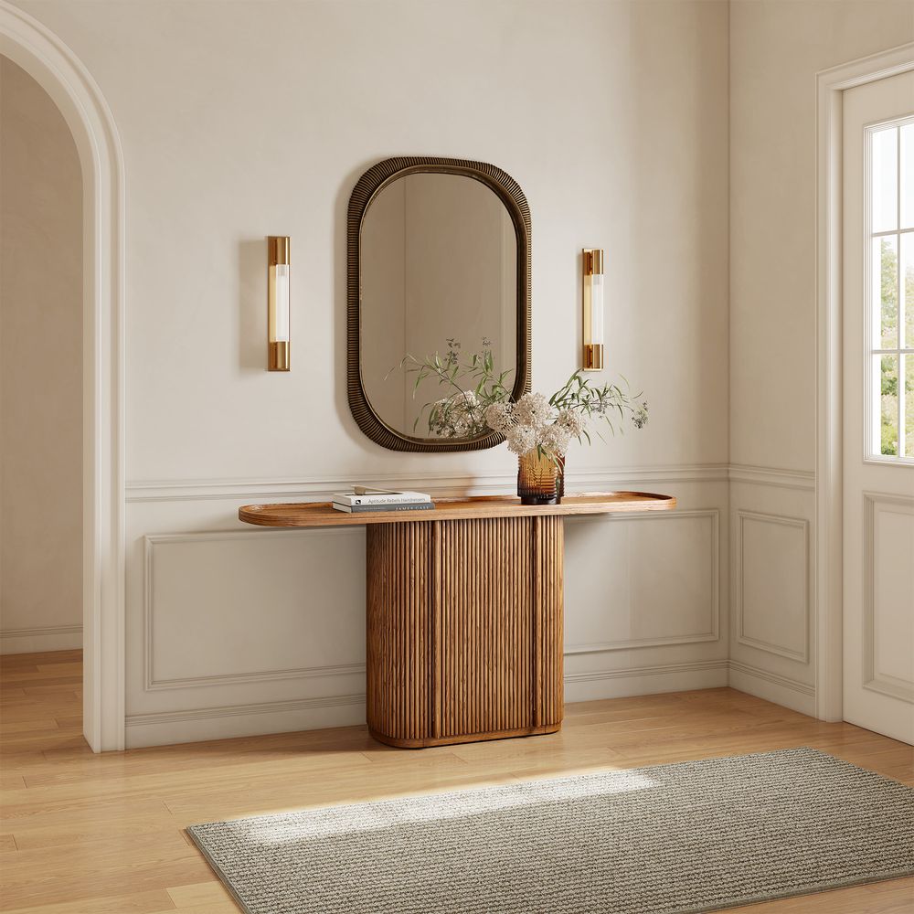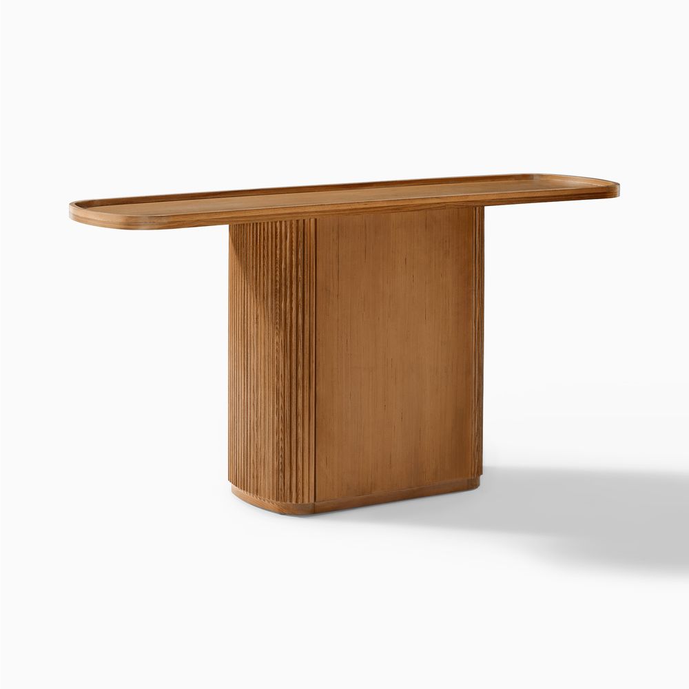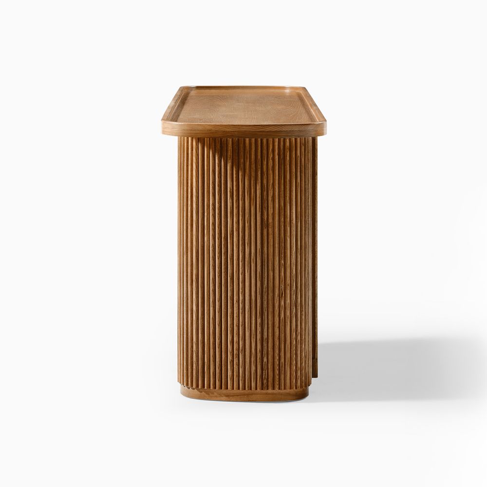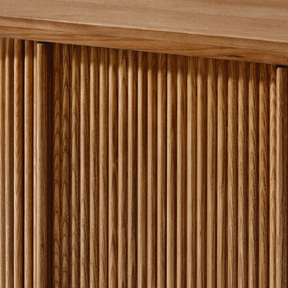 Crafted of solid oak and engineered wood with American oak veneers.All wood is kiln-dried for added durability.Finish is achieved through multistep process in which wood is wire brushed to highlight its rich grain.Wood glazing adds visual interest with greater depth and layering and enhances coloring.Solid wood blocks are used at structural joints for reinforcement.Solid oak fluting presents a natural texture.Color perception may vary due to wood characteristics, lighting, and devices. Wood grain variation is expected, as each is unique.