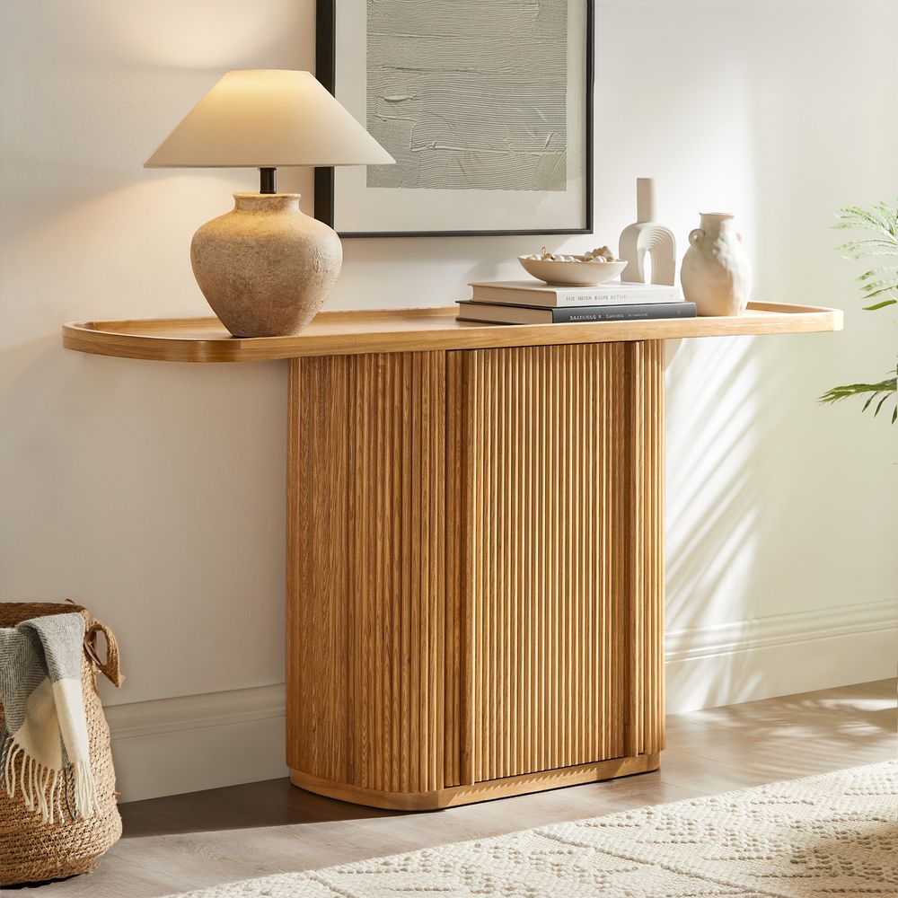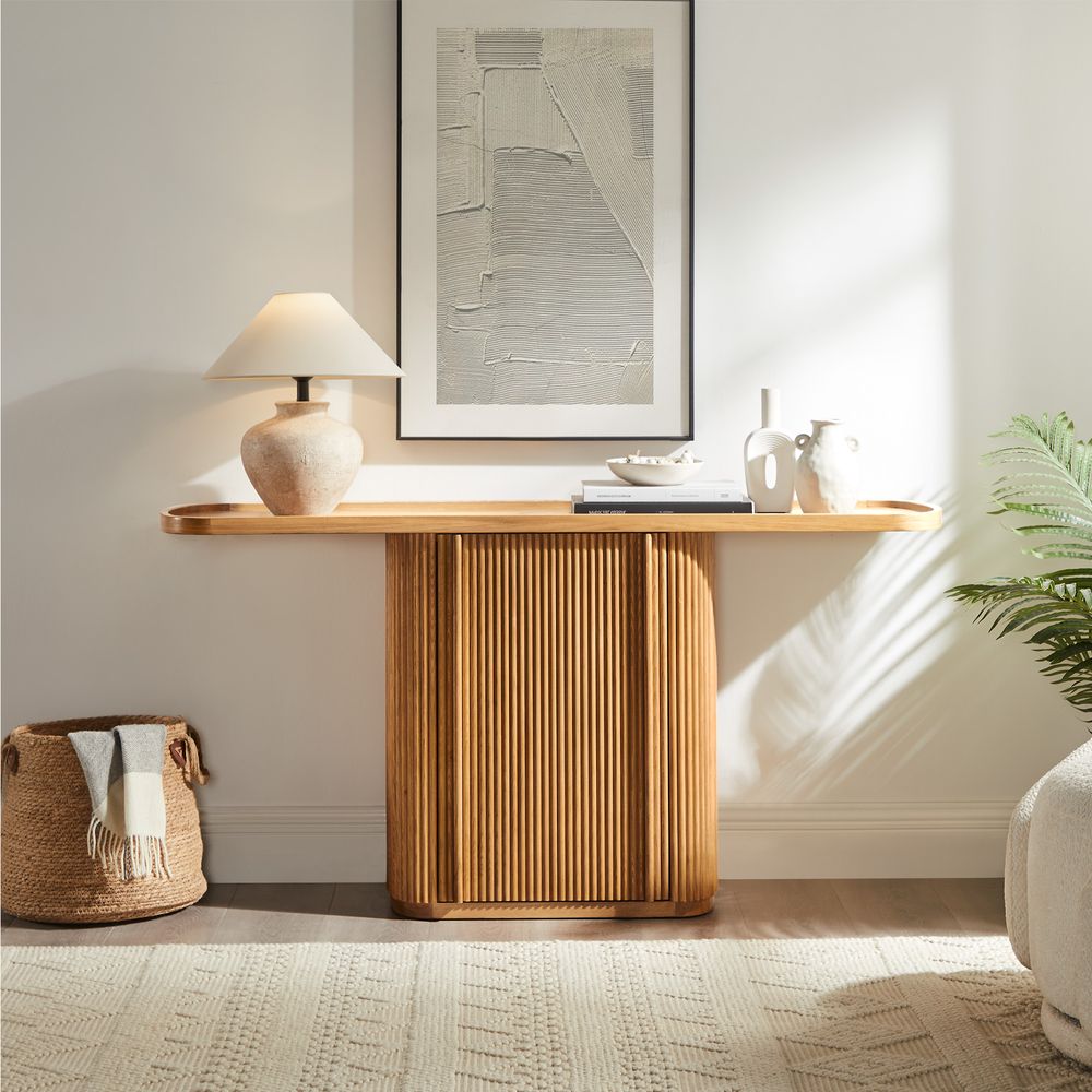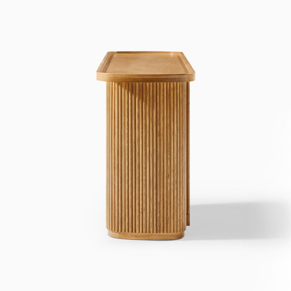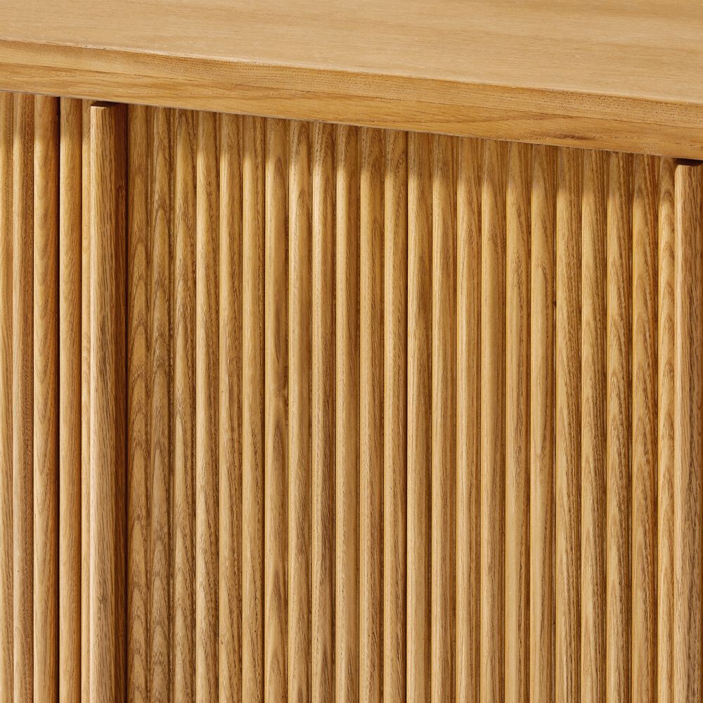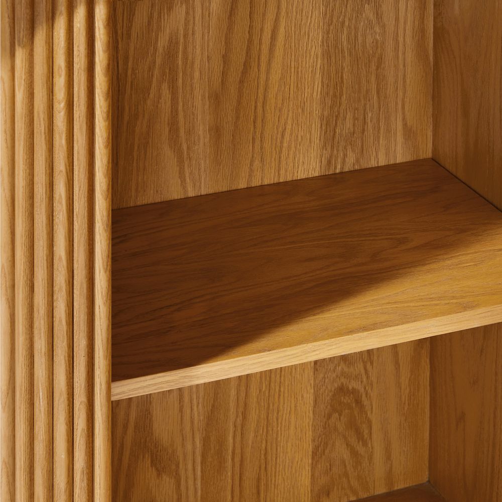 Crafted of American solid oak and plywood with oak veneers.All wood is kiln-dried for added durability.Finish is achieved through multistep process in which wood is wire brushed to highlight its rich grain.Wood glazing adds visual interest with greater depth and layering and enhances coloring.Solid wood blocks are used at structural joints for reinforcement.Solid oak fluting presents a natural texture.Color perception may vary due to wood characteristics, lighting, and devices. Wood grain variation is expected, as each is unique.