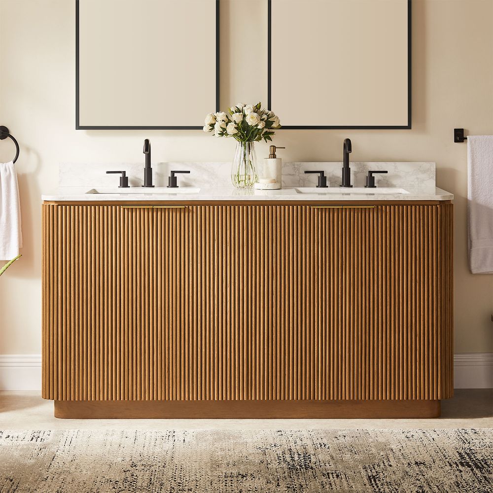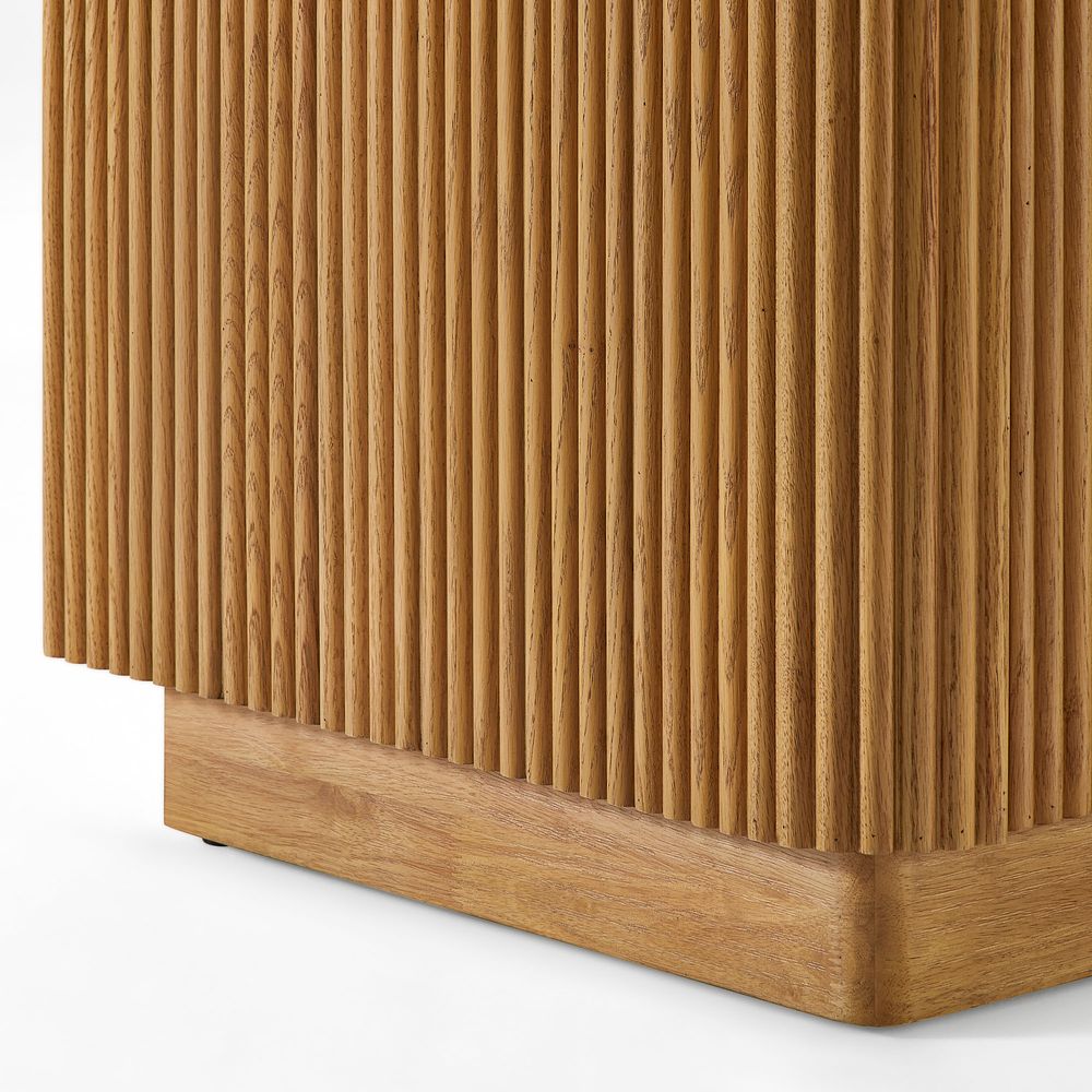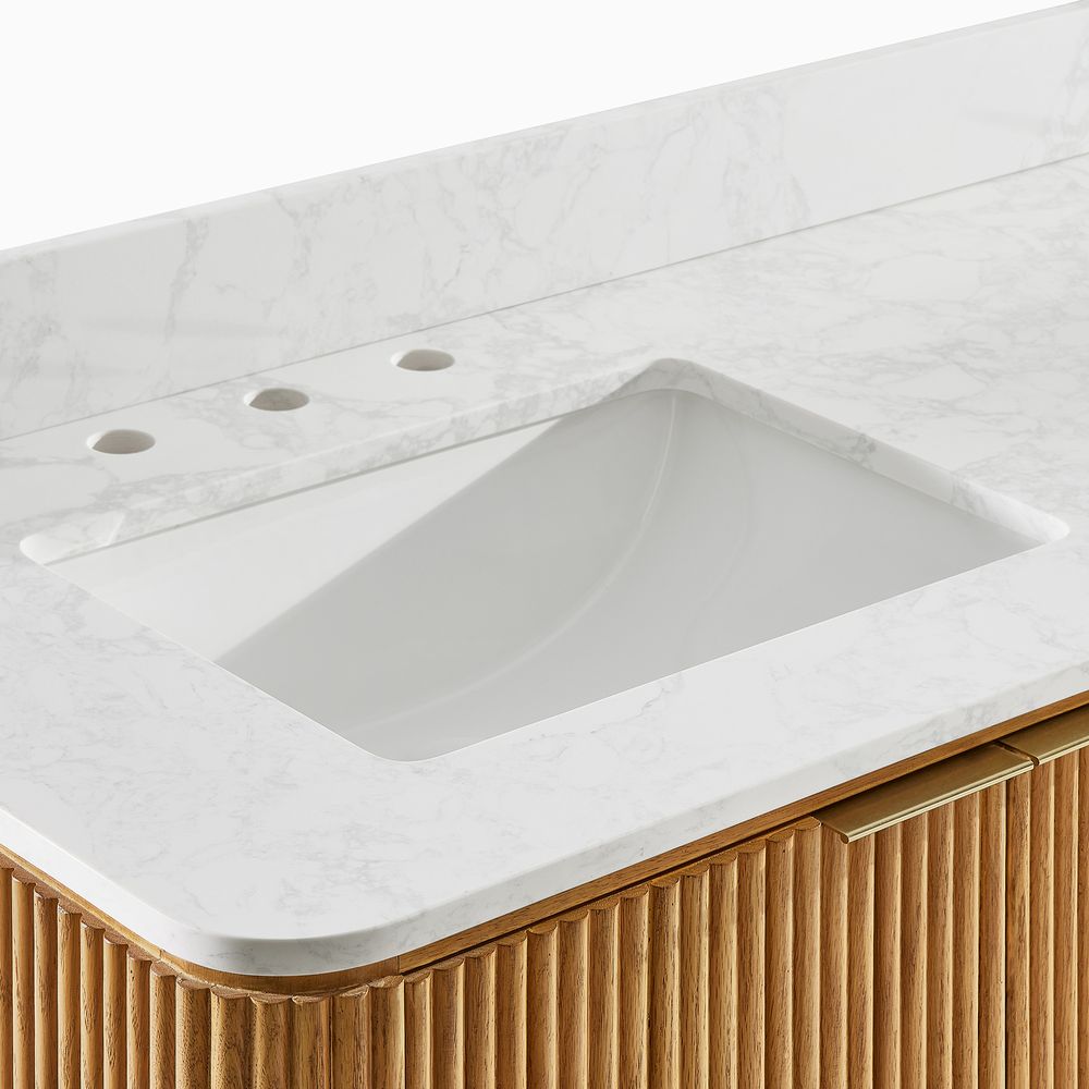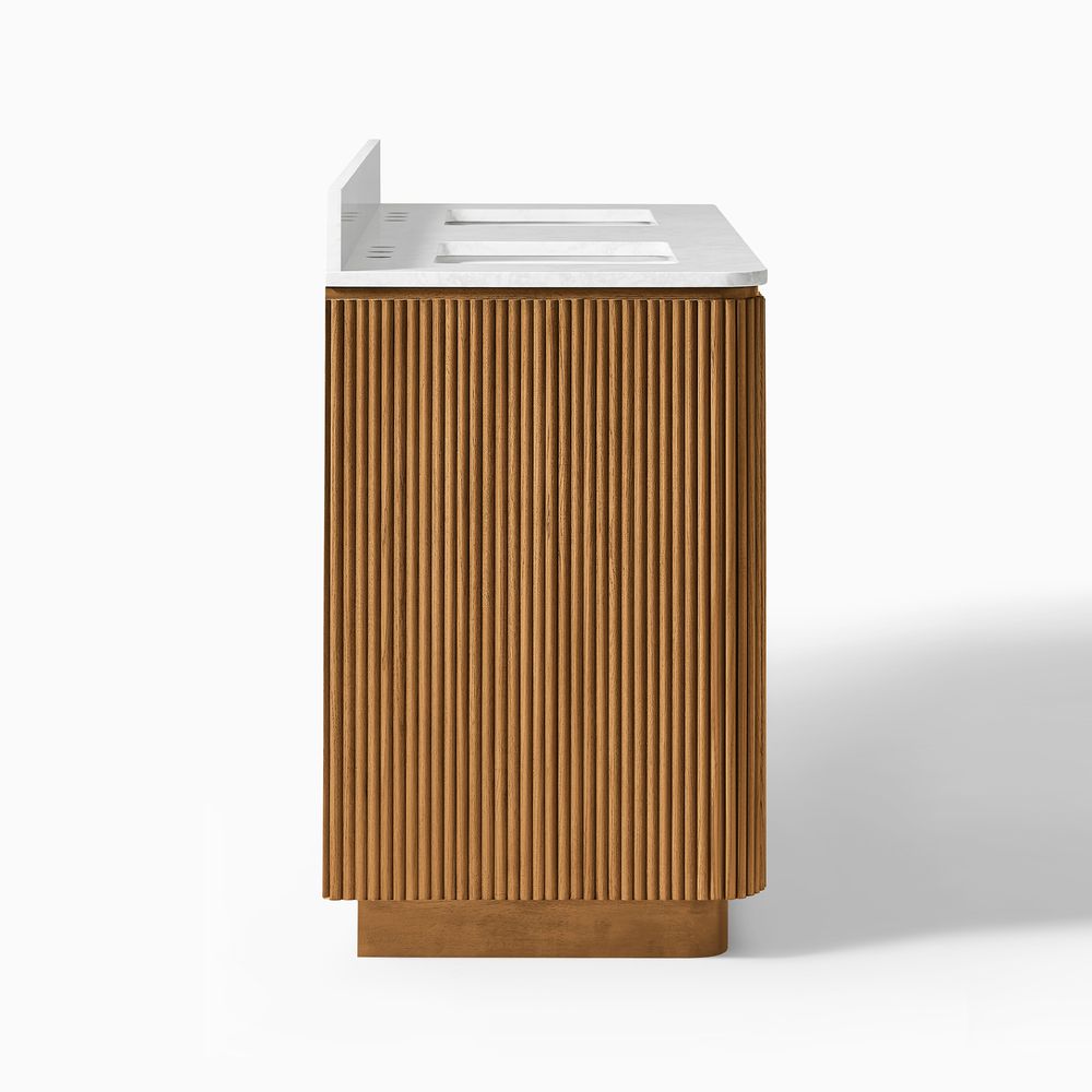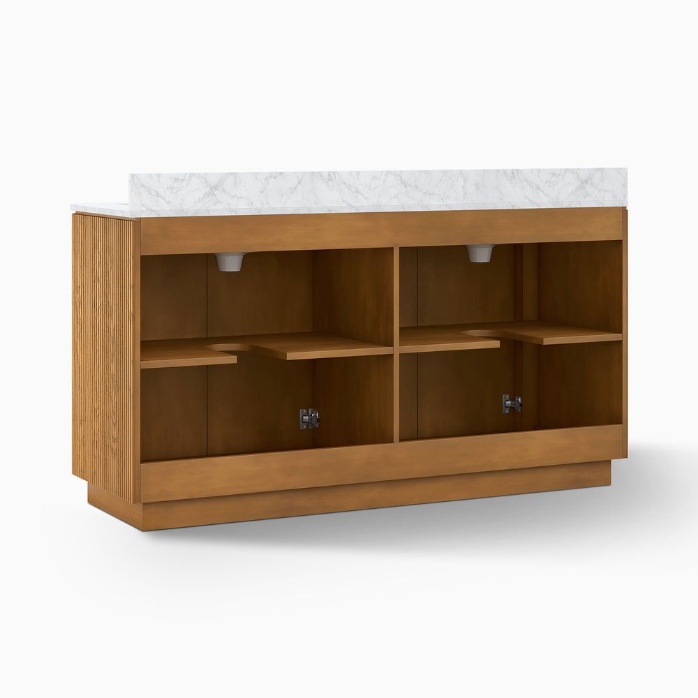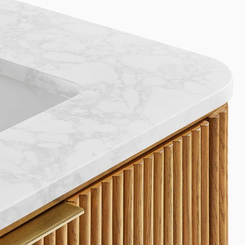 Crafted of engineered stone, American solid oak, and plywood with oak veneers.Countertop and backsplash are honed and sealed for a satin finish with deep veining and natural color contrasts.Finish is achieved through multistep process in which wood is wire brushed to highlight its rich grain.Wood glazing adds visual interest with greater depth and layering and enhances coloring.All wood is kiln-dried for added durability.Solid wood blocks are used at structural joints for reinforcement.Solid oak fluting presents a natural texture.Golden handles against the panel as focal points.Color perception may vary due to wood characteristics, lighting, and devices. Wood grain variation is expected, as each is unique.Variation in the veining of stone is to be expected, as each piece will be unique.
