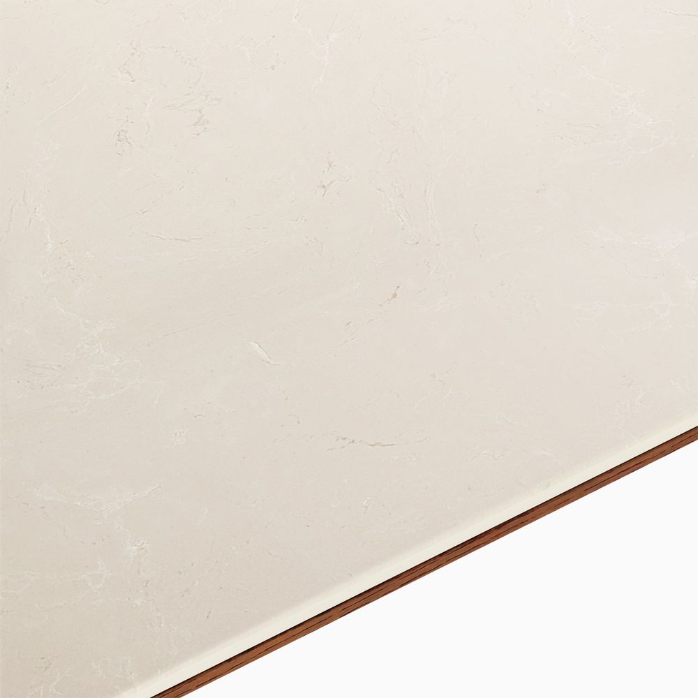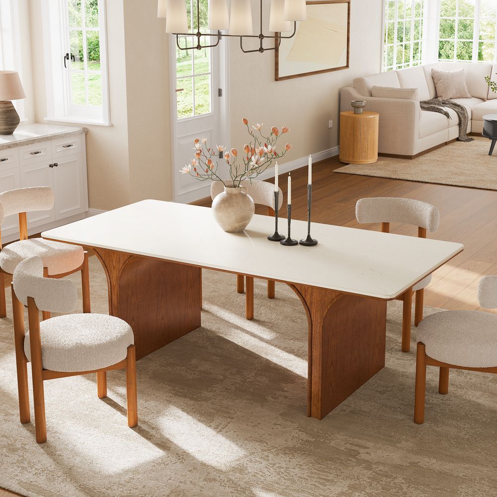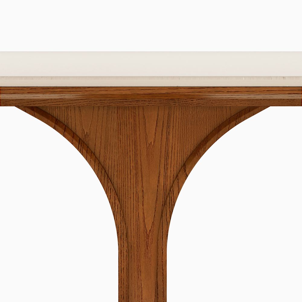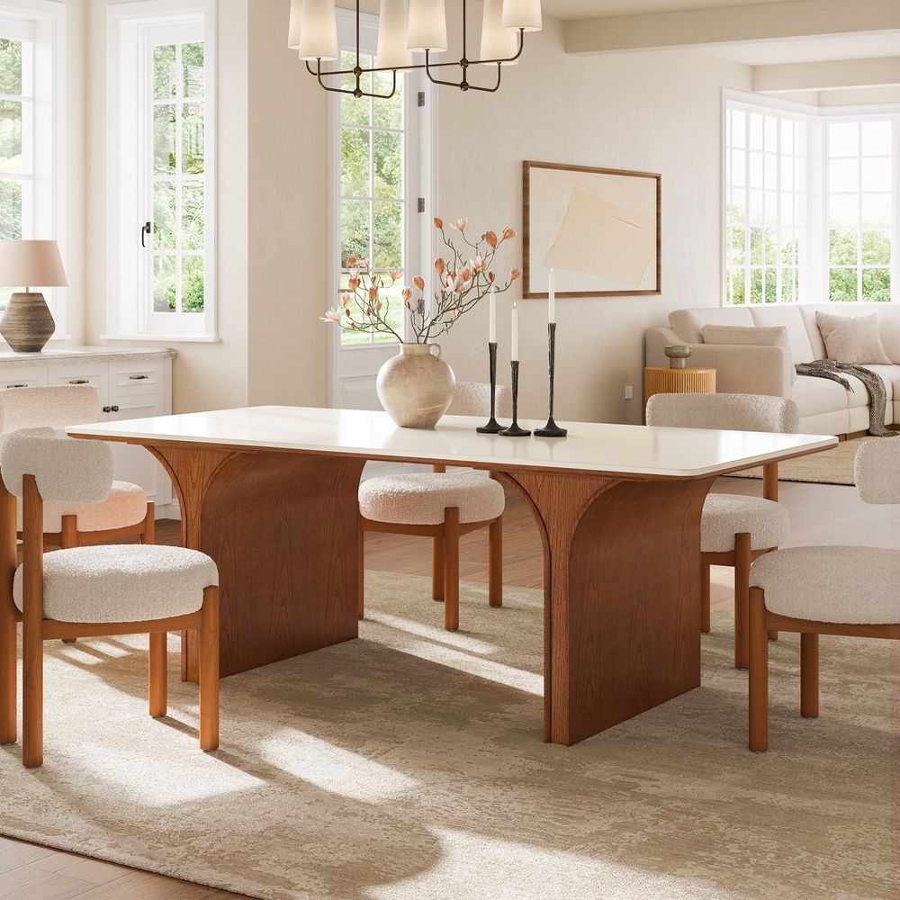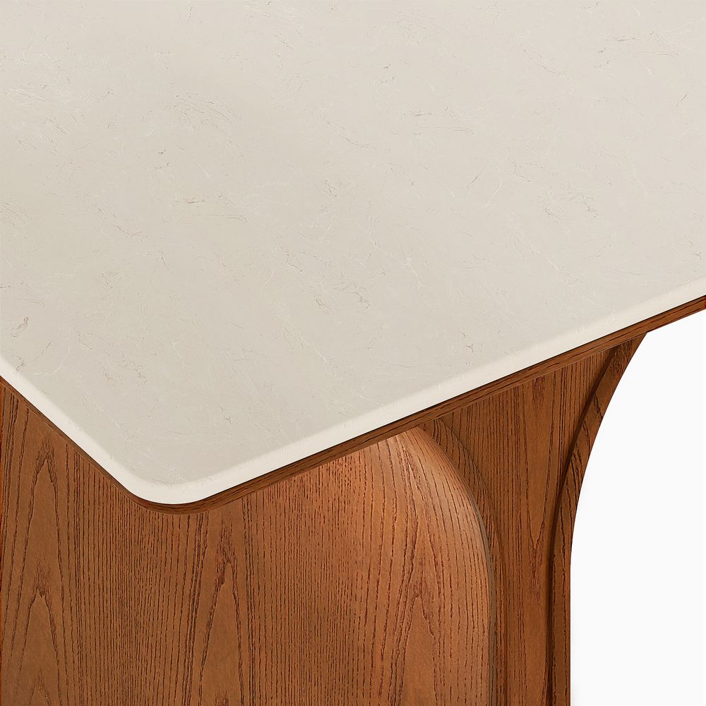 Matilda is defined by architectural form and balanced proportions. Sculpted pedestal-style legs curve inward to form a dome-like opening, offering generous legroom while grounding the design with a strong, sculptural presence. Anchored by a neutral-toned engineered stone top, the table introduces subtle layered pattern and texture, complementing the warm wood base and bringing a quiet, confident elegance to the overall design.
