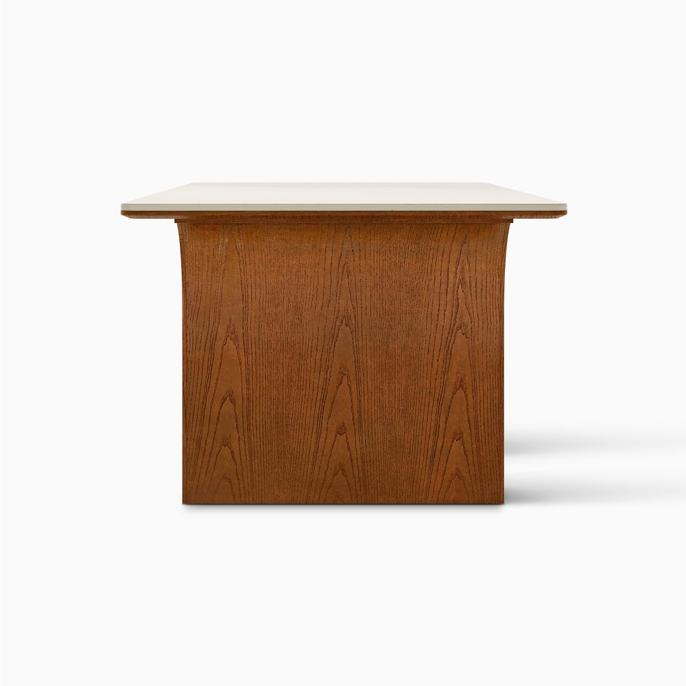 Crafted of engineered stone and plywood with American ash wood veneer.Tabletop is honed and sealed for a satin finish with deep veining and natural color contrasts.Wood glazing adds visual interest with greater depth and layering and enhances coloring.Base molding for enhanced visual appeal and structure.84" table comfortably seats 6-8.Color perception may vary due to wood characteristics, lighting, and devices. Wood grain variation is expected, as each is unique.Variation in the veining of stone is to be expected, as each piece will be unique.