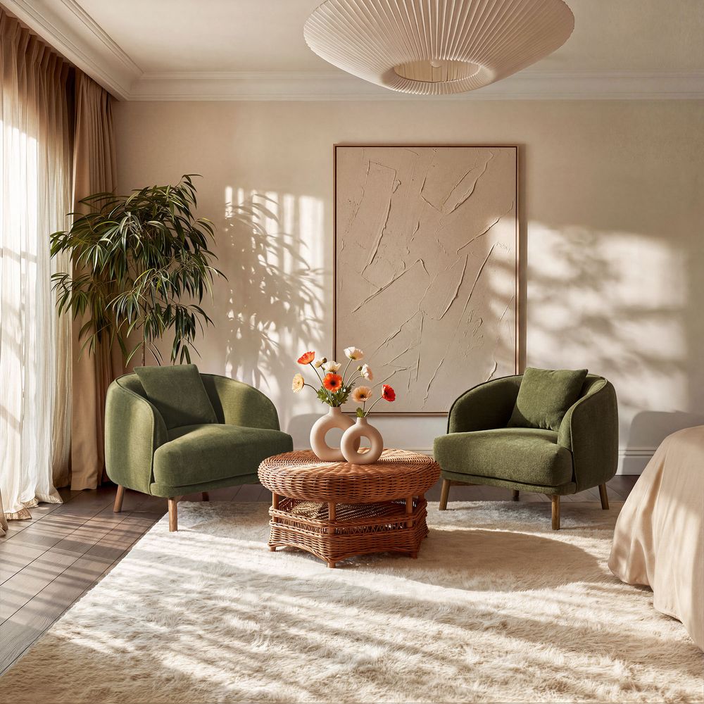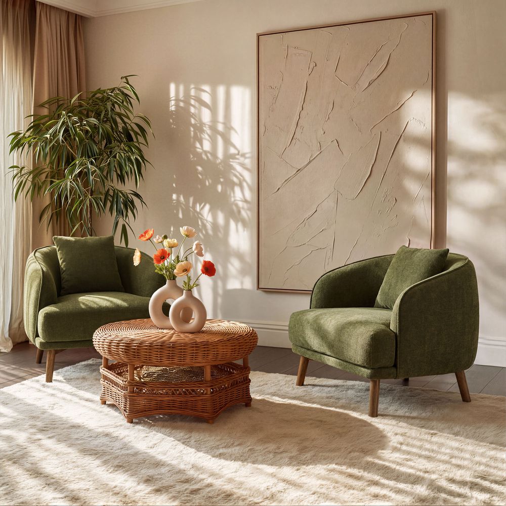 Mellow features softly rounded proportions that create an inviting, cocoon-like presence. Gently curved arms wrap around a generously cushioned seat, while a back cushion adds relaxed support for everyday lounging. Set on subtly tapered solid wood legs, the piece is lifted with a light, grounded feel that balances the plush upholstery—creating a laid-back design suited for modern, contemporary, coastal, MCM, and transitional styles alike.