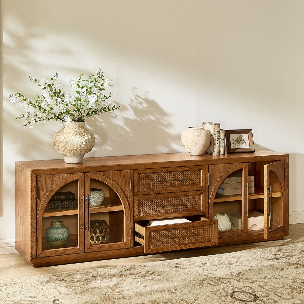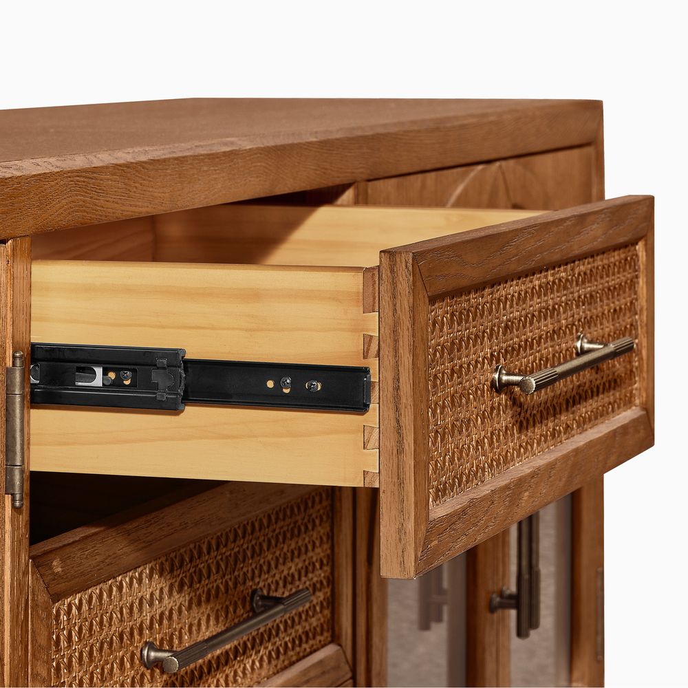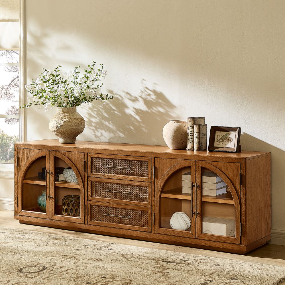 Crafted of American solid oak and engineered wood with oak veneers.All wood is kiln-dried for added durability.Finish is achieved through multistep process in which wood is wire brushed to highlight its rich grain.Drawers are crafted with precision dovetail joints for superior sturdiness and weight-bearing strength.Solid wood blocks are used at structural joints for reinforcement.Designed for TVs up to 85", 2 cord cutouts in back panel for cable management.Color perception may vary due to wood characteristics, lighting, and devices. Wood grain variation is expected, as each is unique.