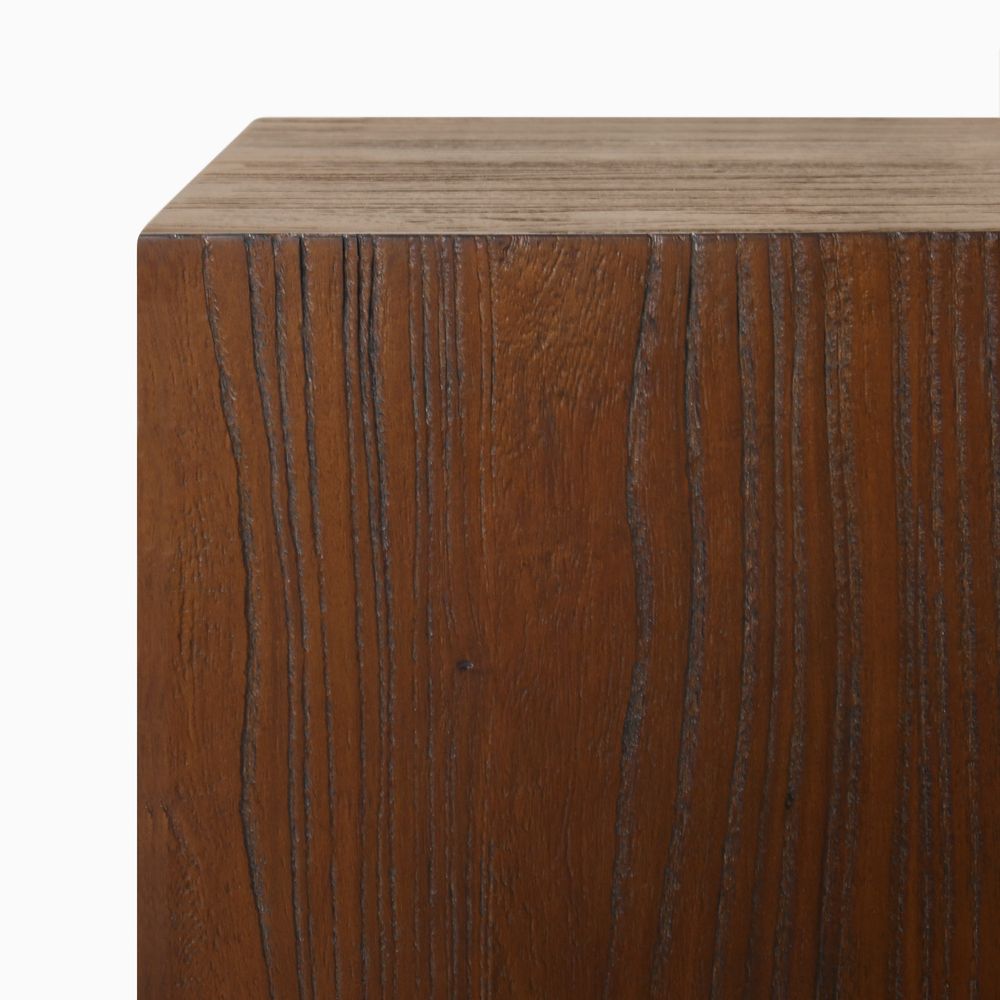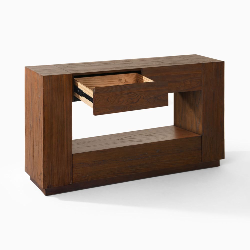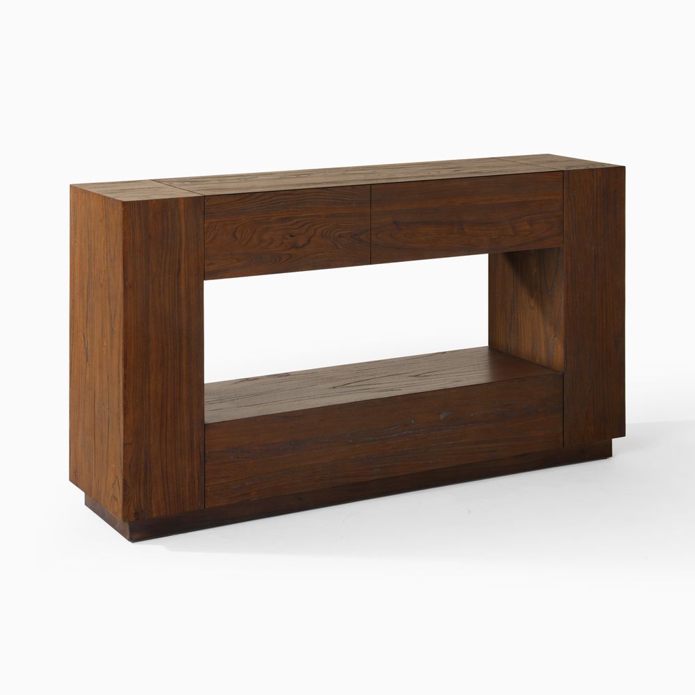 Torben console table boasts a substantial base and is artisan-built from old elm wood. The wood is sustainably sourced and features unique organic markings. Distinct variations in colour, grain and texture make each individual piece a true one of a kind.