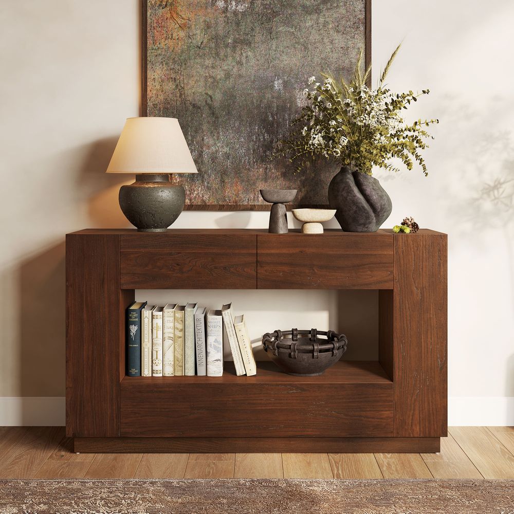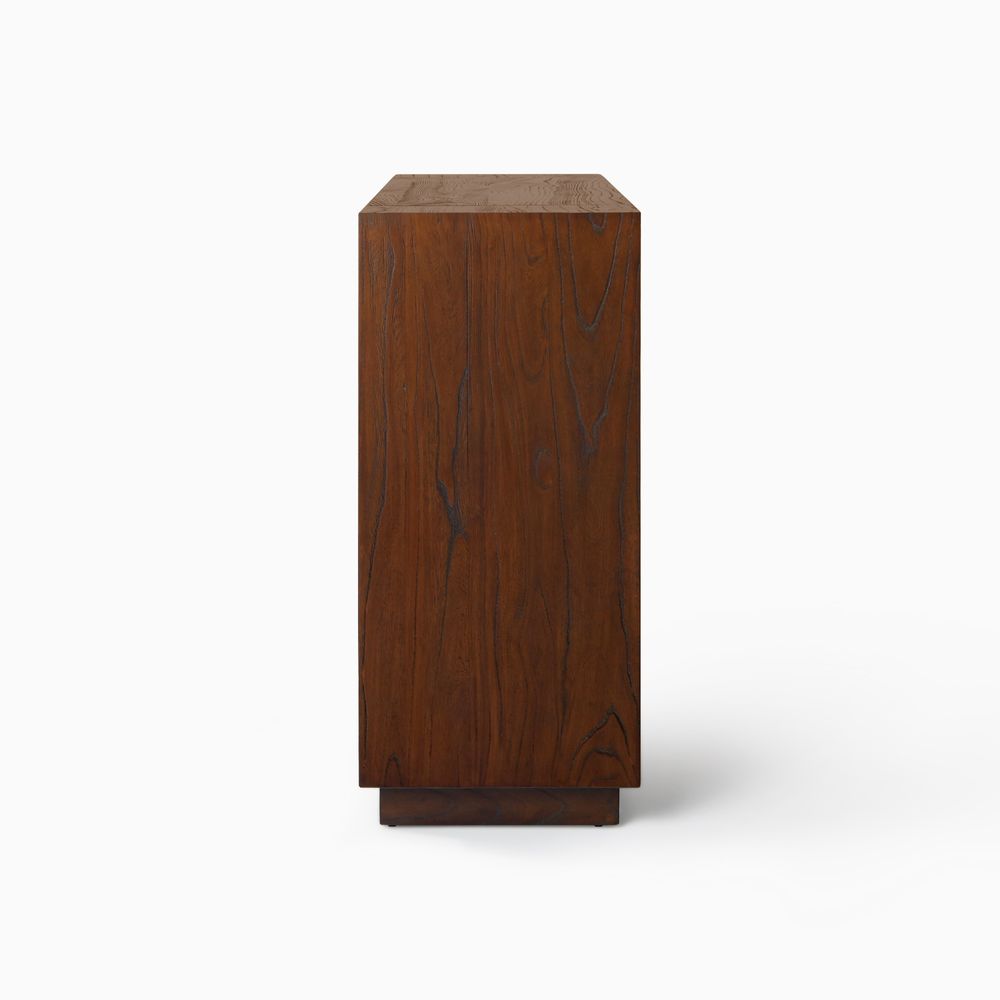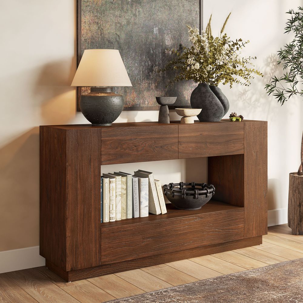 Crafted of old elm and plywood with old elm veneers.Crafted from old elm wood, each piece displays organic variations in texture and detail, including small splits, knots and joint lines.Natural wood highlights its rustic character, shaped by time and nature.All wood is kiln-dried for added durability.Drawers are crafted with precision dovetail joints for superior sturdiness and weight-bearing strength.Designed for TVs up to 60".
