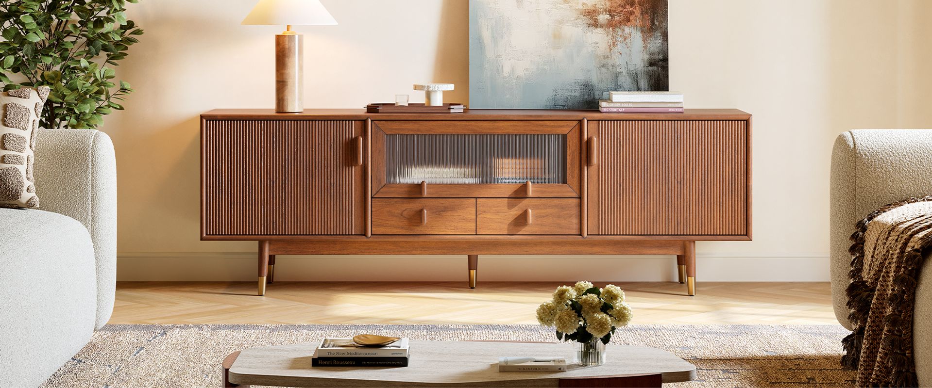 Crafted of solid wood and engineered wood with American walnut veneers.All wood is kiln-dried for added durability.Finish is achieved through multistep process in which wood is wire brushed to highlight its rich grain.Wood glazing adds visual interest with greater depth and layering and enhances coloring.Solid wood blocks are used at structural joints for reinforcement.Solid wood fluting presents a natural texture.Designed for TVs up to 75", 5 cord cutout in back panel for cable management.Color perception may vary due to wood characteristics, lighting, and devices. Wood grain variation is expected, as each is unique.