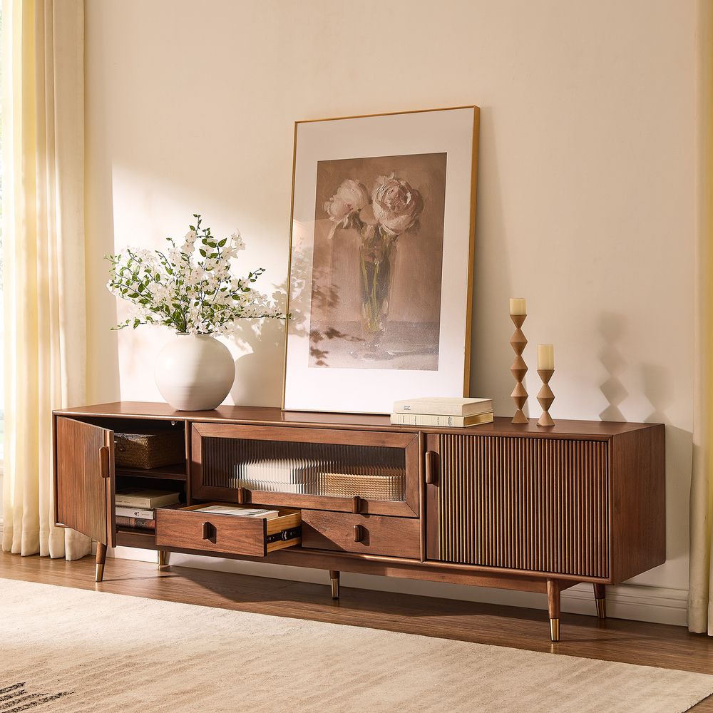 Crafted of solid wood and engineered wood with American walnut veneers.All wood is kiln-dried for added durability.Finish is achieved through multistep process in which wood is wire brushed to highlight its rich grain.Wood glazing adds visual interest with greater depth and layering and enhances coloring.Solid wood blocks are used at structural joints for reinforcement.Solid wood fluting presents a natural texture.Designed for TVs up to 85", 5 cord cutout in back panel for cable management.Color perception may vary due to wood characteristics, lighting, and devices. Wood grain variation is expected, as each is unique.