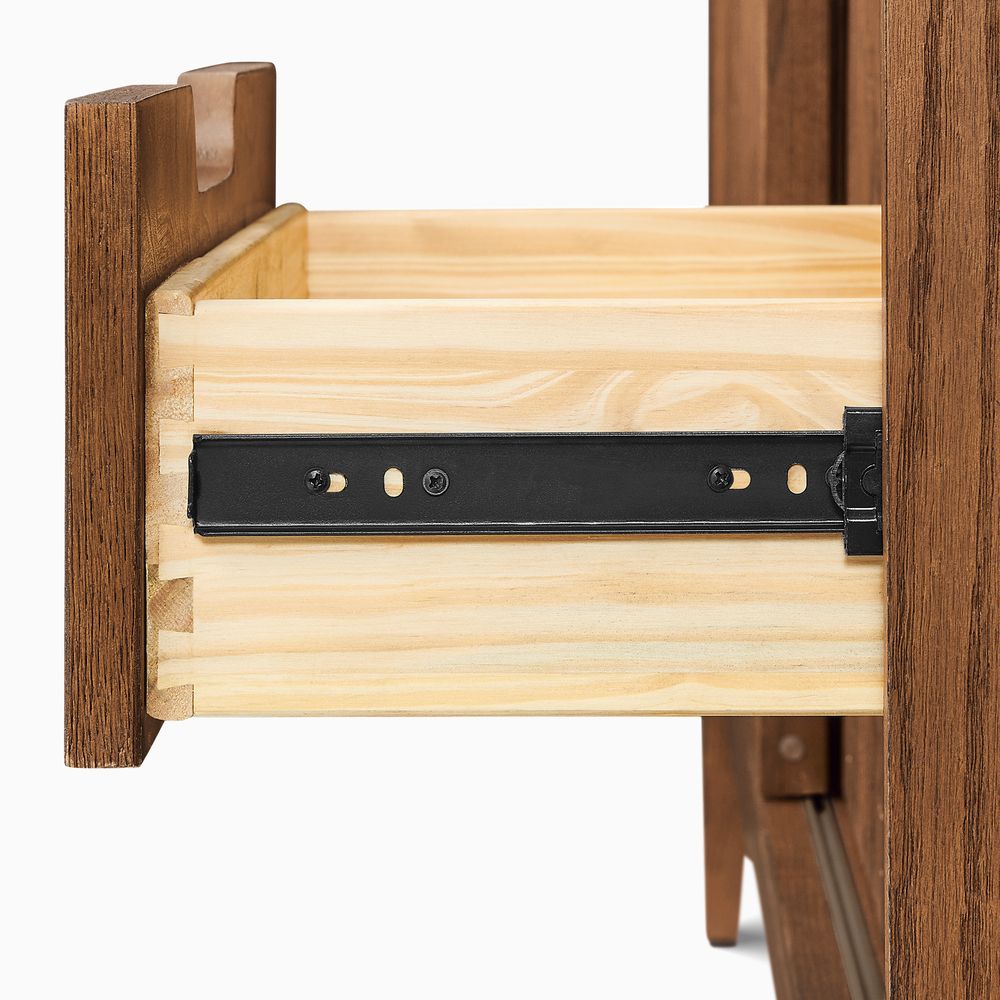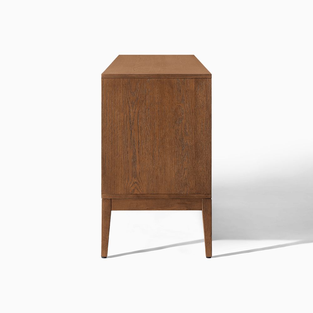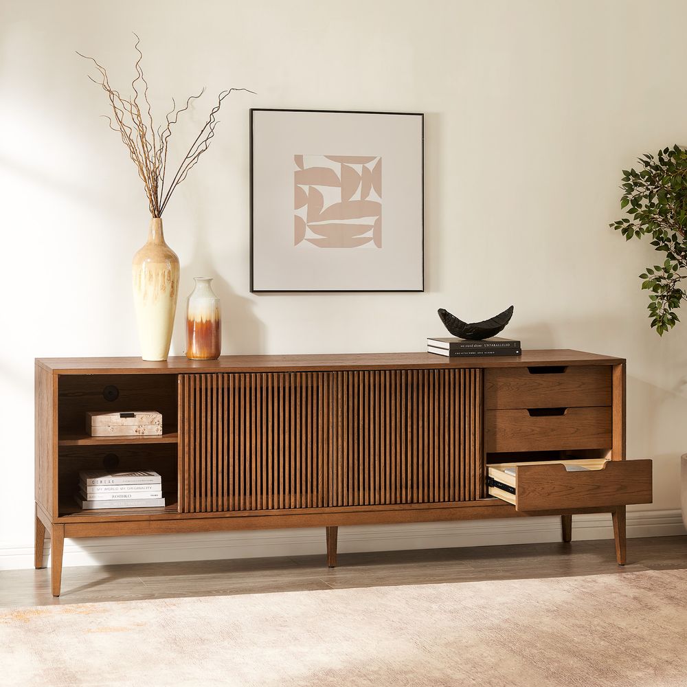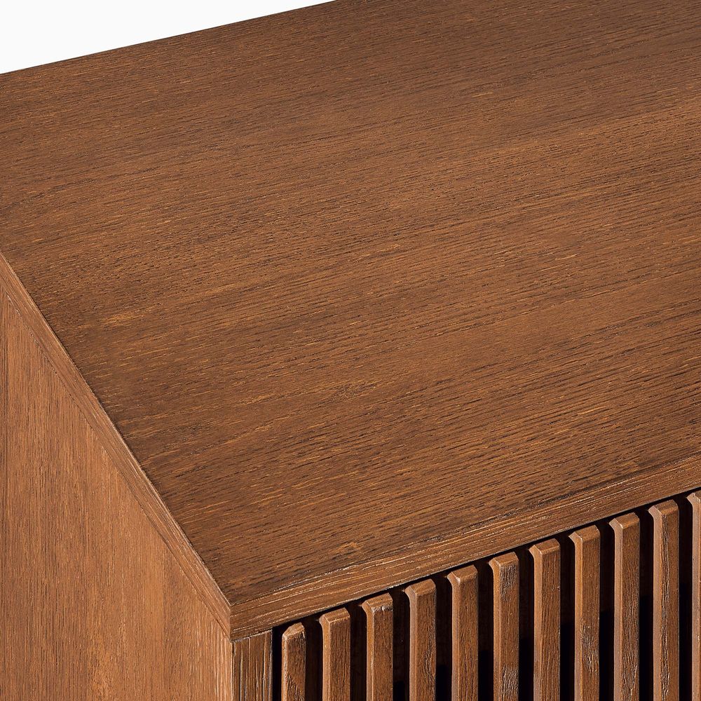 Crafted of American oak and engineered wood with oak veneers.All wood is kiln-dried for added durability.Finish is achieved through multistep process in which wood is wire brushed to highlight its rich grain.Drawers are crafted with precision dovetail joints for superior sturdiness and weight-bearing strength.Slatted sliding doors for effortless access and minimalist style.Designed for TVs up to 85", 4 cord cutouts in back panel for cable management.Color perception may vary due to wood characteristics, lighting, and devices. Wood grain variation is expected, as each is unique.