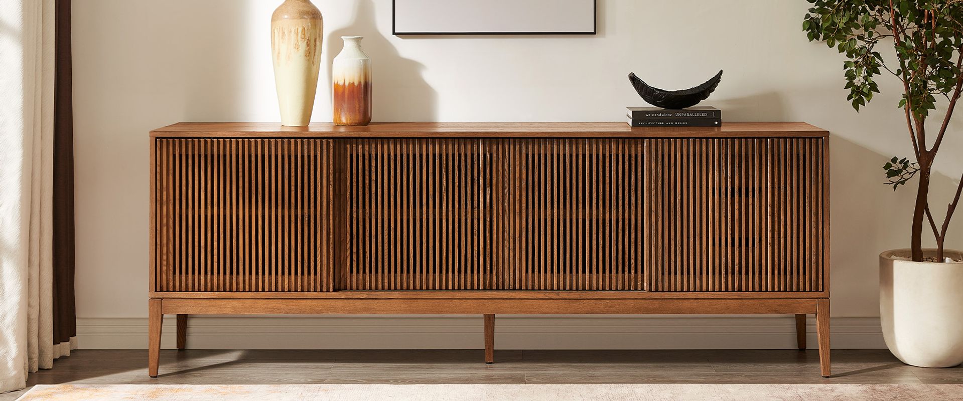 Astrid media console showcases a refined design with sleek vertical slats and a warm oak finish, exuding modern elegance. The solid wood legs add a touch of mid-century charm, while the spacious interior provides ample storage. Its sophisticated style makes it a striking focal point in any contemporary living space.