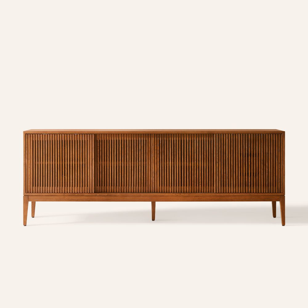 Astrid media console showcases a refined design with sleek vertical slats and a warm oak finish, exuding modern elegance. The solid wood legs add a touch of mid-century charm, while the spacious interior provides ample storage. Its sophisticated style makes it a striking focal point in any contemporary living space.