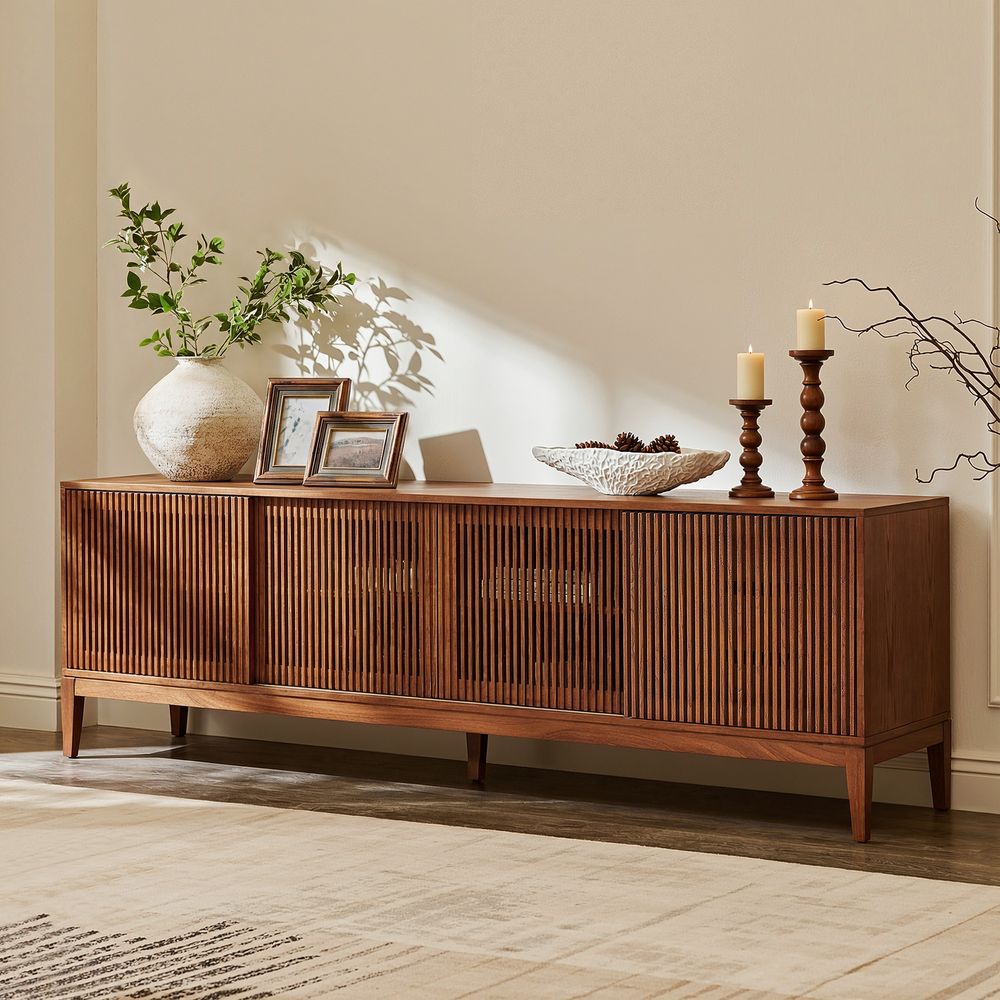 Astrid media console showcases a refined design with sleek vertical slats and a warm oak finish, exuding modern elegance. The solid wood legs add a touch of mid-century charm, while the spacious interior provides ample storage. Its sophisticated style makes it a striking focal point in any contemporary living space.
