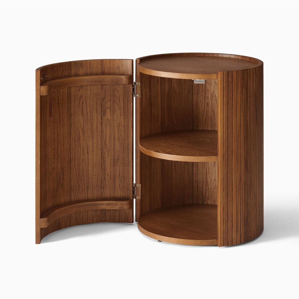 Elliot side table combines functionality with aesthetic appeal, featuring a rich wooden finish and elegant fluted detailing. The round shape and concealed storage offer practicality, while the open shelves provide space for displaying decor. Its harmonious blend of form and function makes it a perfect addition to any living space, exuding warmth and sophistication.