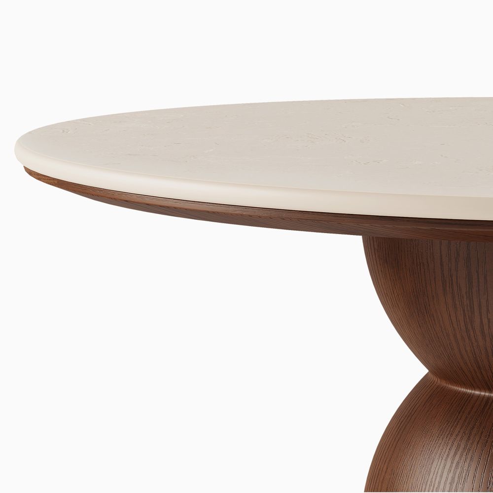 The Sigrid dining table captivates with its modern fusion of natural and minimalist elements. The textured engineered stone tabletop, softened by rounded corners, exudes a refined texture, while the sculpted resin bases create a striking balance of elegance and dynamism.