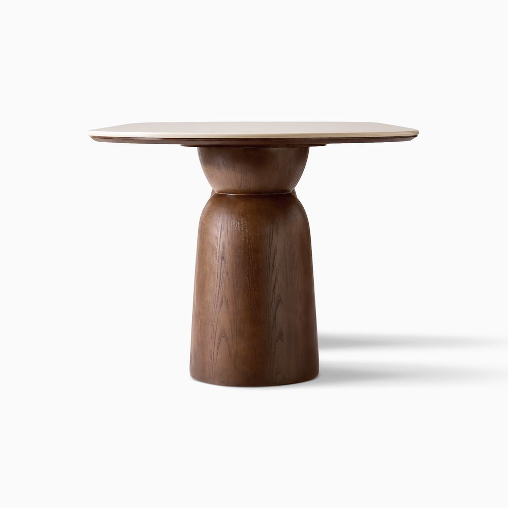 The Sigrid dining table captivates with its modern fusion of natural and minimalist elements. The textured sintered stone tabletop, softened by rounded corners, exudes a refined texture, while the sculpted resin bases create a striking balance of elegance and dynamism.