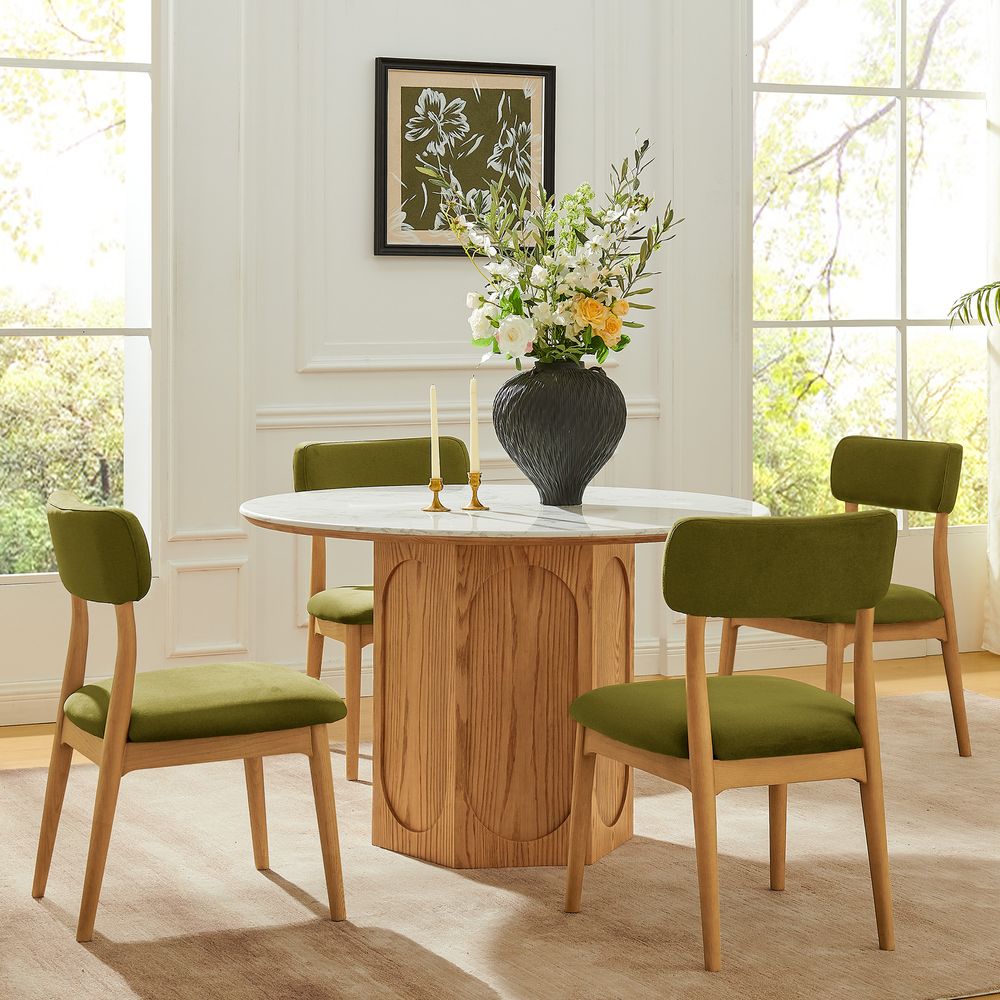 Crafted of solid wood and plywood with American oak veneers.Tabletop is honed and sealed for a satin finish with deep veining and natural color contrasts.All wood is kiln-dried for added durability.Wood glazing adds visual interest with greater depth and layering and enhances coloring.47" table comfortably seats 4.Color perception may vary due to wood characteristics, lighting, and devices. Wood grain variation is expected, as each is unique.Variation in the veining of stone is to be expected, as each piece will be unique.