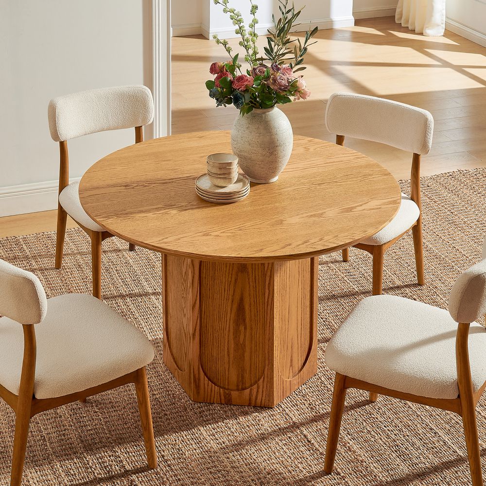 Crafted of solid wood and plywood with American oak veneers.All wood is kiln-dried for added durability.Wood glazing adds visual interest with greater depth and layering and enhances coloring.47" table comfortably seats 4.Color perception may vary due to wood characteristics, lighting, and devices. Wood grain variation is expected, as each is unique.