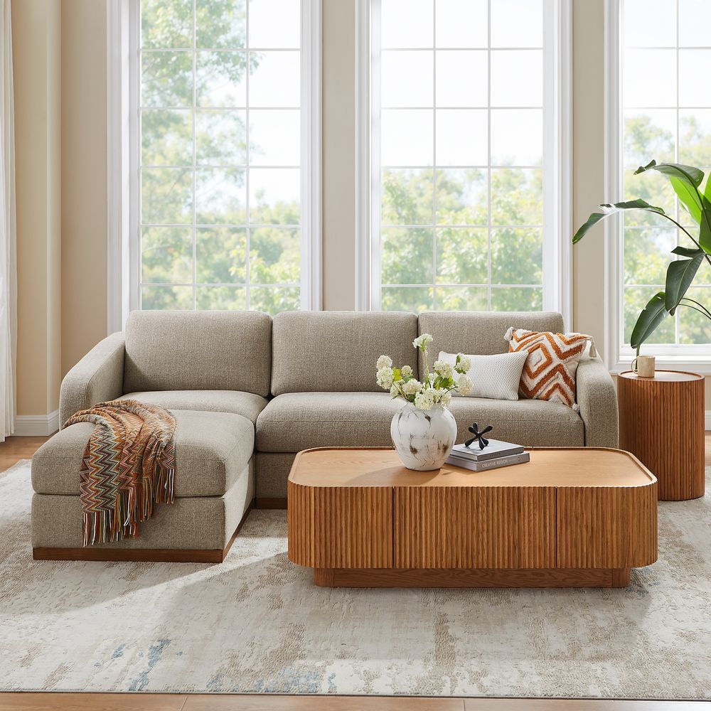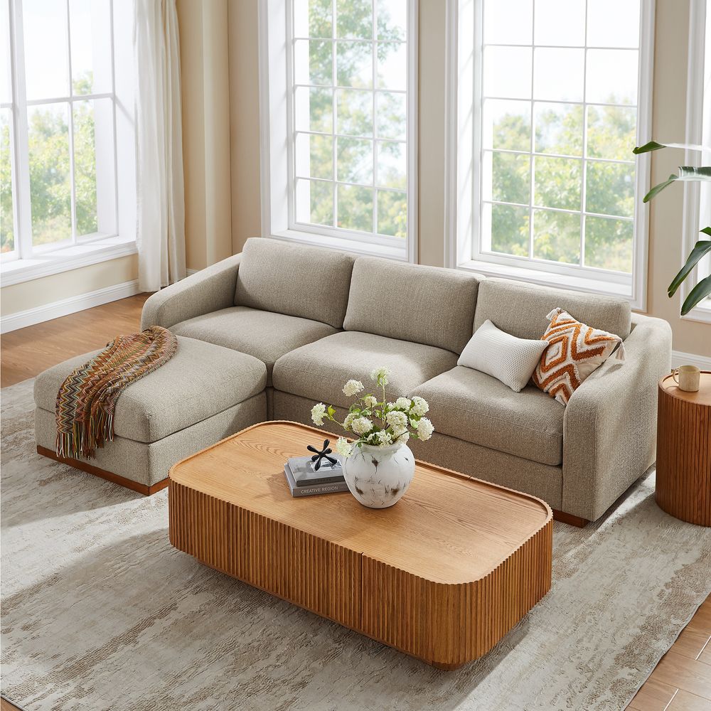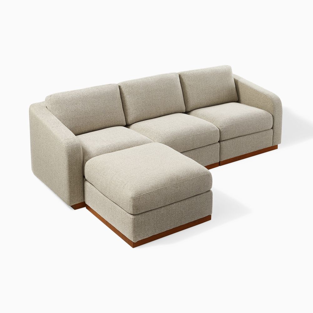 Preconfigured sofa consists of 1 left armchair, 1 right armchair, 1 armless chair and 1 ottoman.Solid ash wood and plywood frame.Lightweight and breathable, linen fabric blends casual elegance with everyday comfort.Seat cushions have fiber-wrapped, high-resiliency polyurethane foam cores.Sinuous spring suspension with reinforced elastic webbing.The upholstery on the sofa adds soft padding for cozy, stylish seating surfaces.Cushion covers unzip to remove.Included sectional connectors ensure that components are secured tightly together; lift upward to release.Items purchased at different times may not match due to different dye lots, also color perception can vary by lighting and devices.