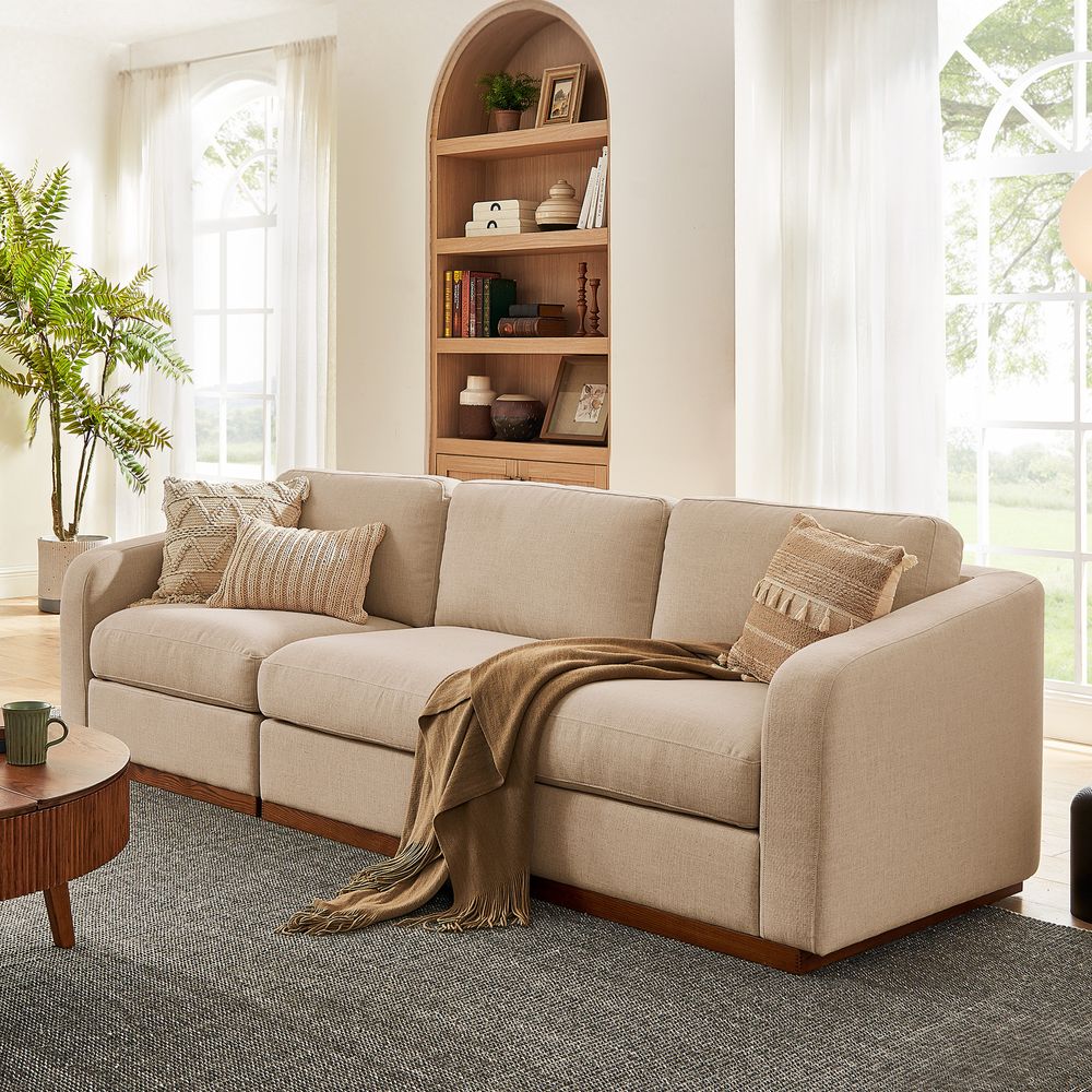 Preconfigured sofa consists of 1 left armchair, 1 right armchair, 1 armless chair.Solid ash wood and plywood frame.This richly textured tight weave is inherently stain resistant and highly durable.Seat cushions have fiber-wrapped, high-resiliency polyurethane foam cores.Sinuous spring suspension with reinforced elastic webbing.The upholstery on the sofa adds soft padding for cozy, stylish seating surfaces.Cushion covers unzip to remove.Included sectional connectors ensure that components are secured tightly together; lift upward to release.Items purchased at different times may not match due to different dye lots, also color perception can vary by lighting and devices.
