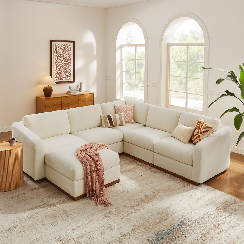 Preconfigured sofa consists of 1 left armchair, 1 right armchair, 1 corner chair, 1 ottoman and 2 armless chairs.American solid ash wood and plywood frame.Cotton fabric is breathable, soft, durable, and easy to care for.Seat cushions have fiber-wrapped, high-resiliency polyurethane foam cores.Sinuous spring suspension with reinforced elastic webbing.The upholstery on the sofa adds soft padding for cozy, stylish seating surfaces.Cushion covers unzip to remove.Included sectional connectors ensure that components are secured tightly together; lift upward to release.Items purchased at different times may not match due to different dye lots, also color perception can vary by lighting and devices.