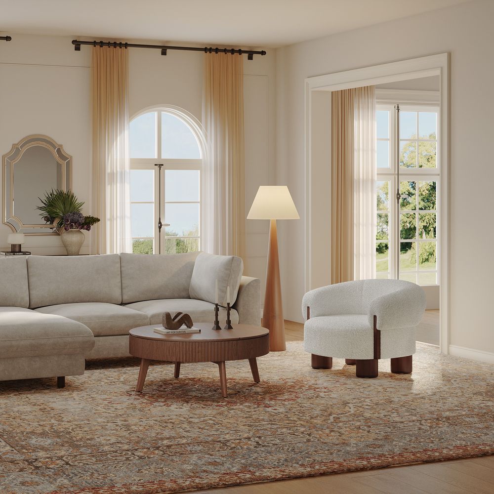 Solid wood and plywood frame.Bouclé fabric with subtle striation and a cozy handfeel.Seat cushions have fiber-wrapped, high-resiliency polyurethane foam cores.The upholstery on the chair adds soft padding for cozy, stylish seating surfaces.Items purchased at different times may not match due to different dye lots, also color perception can vary by lighting and devices.