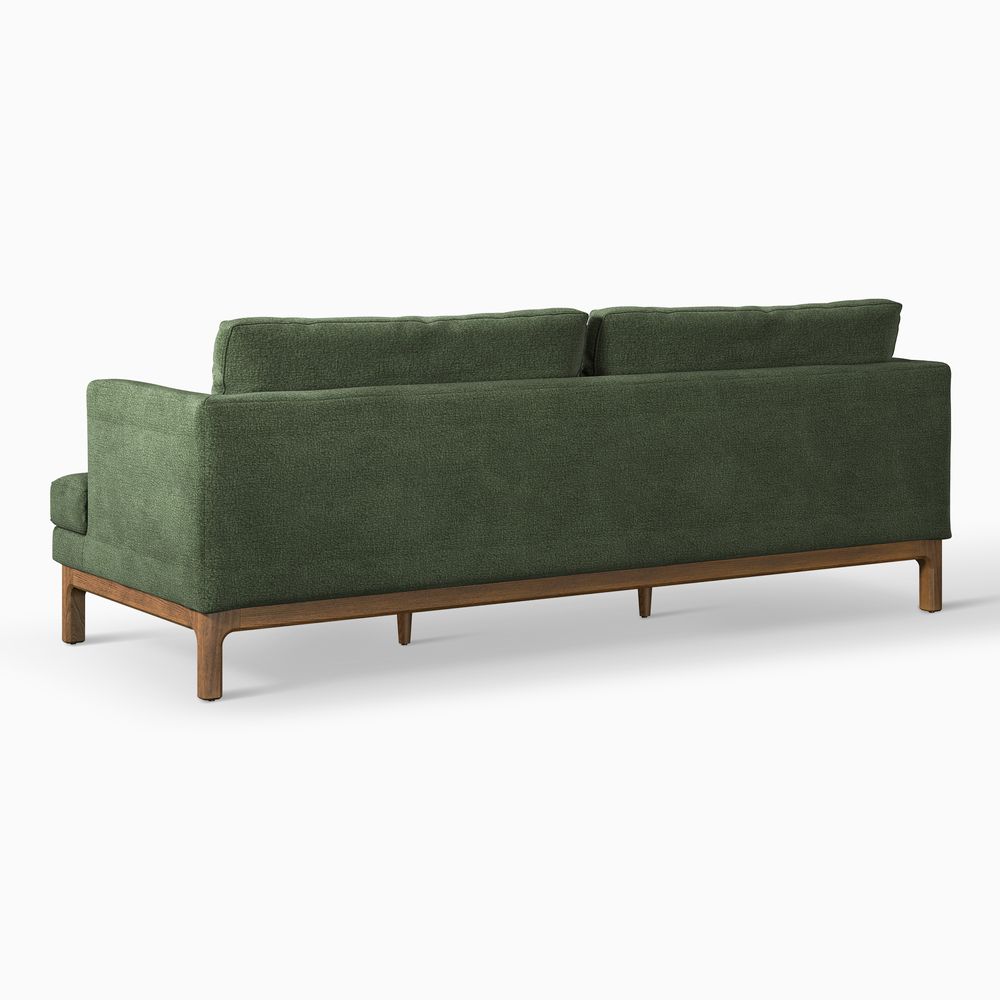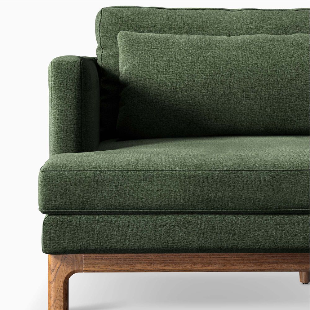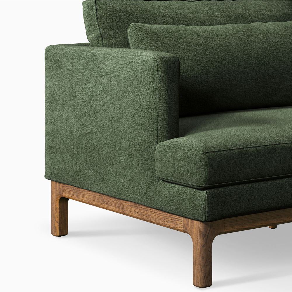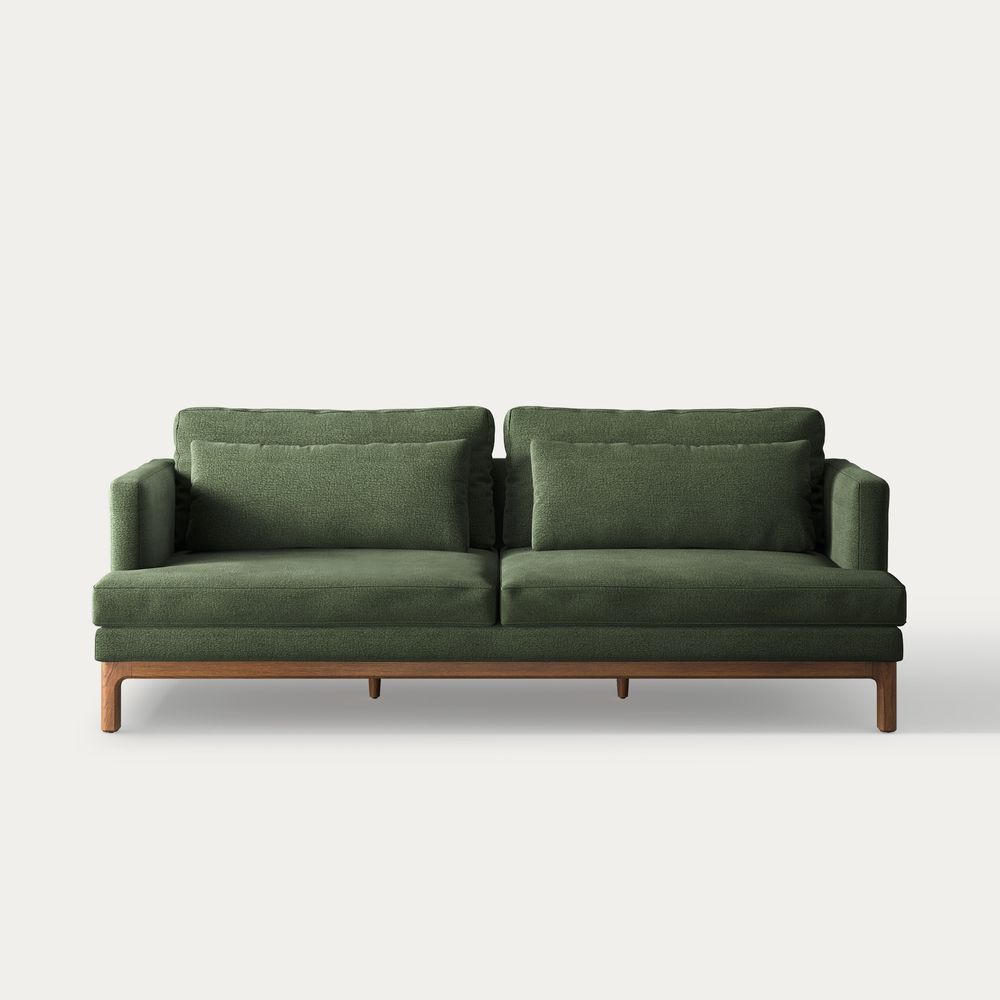 Nori is defined by clean architectural lines, pairing a slim upright frame with generously deep seating. Elevated back cushions enhance support while maintaining a relaxed, modern presence. A raised wood base with softly curved detailing lightens the silhouette and brings warmth to the piece, balancing precision with comfort.