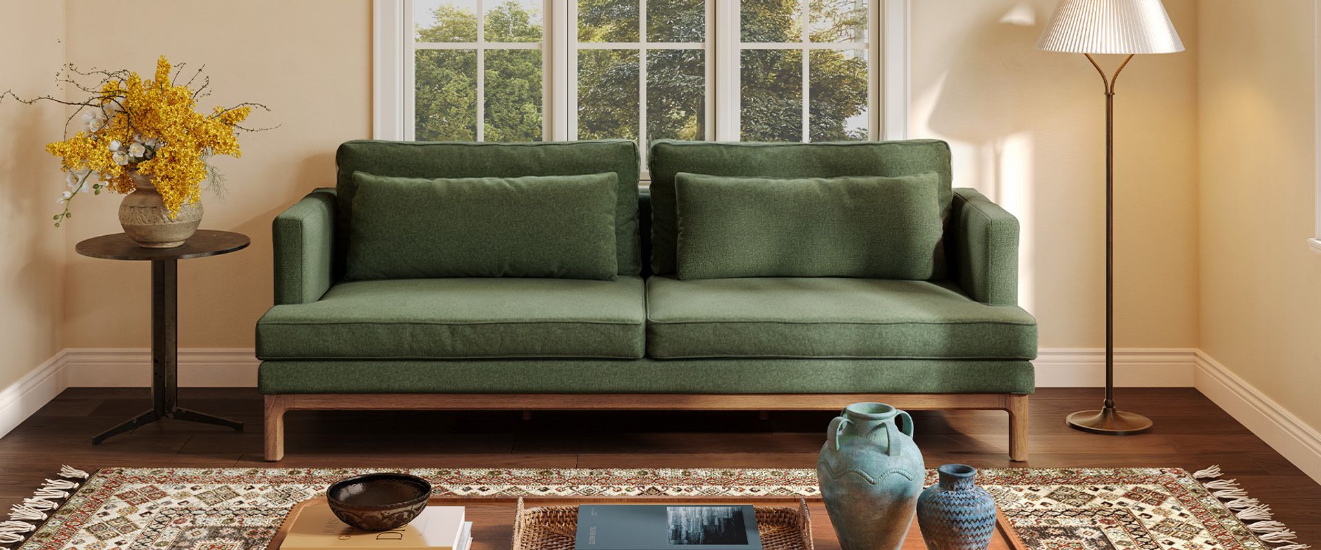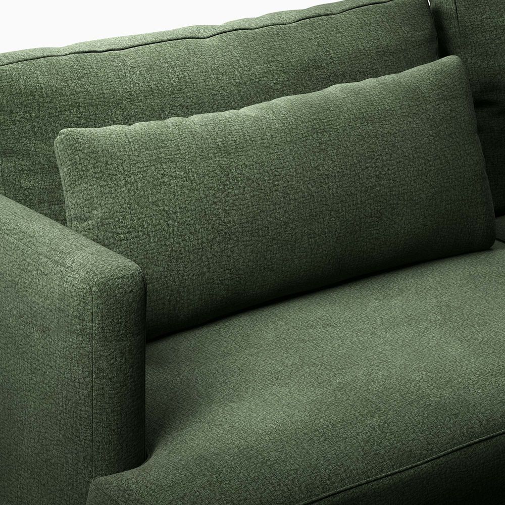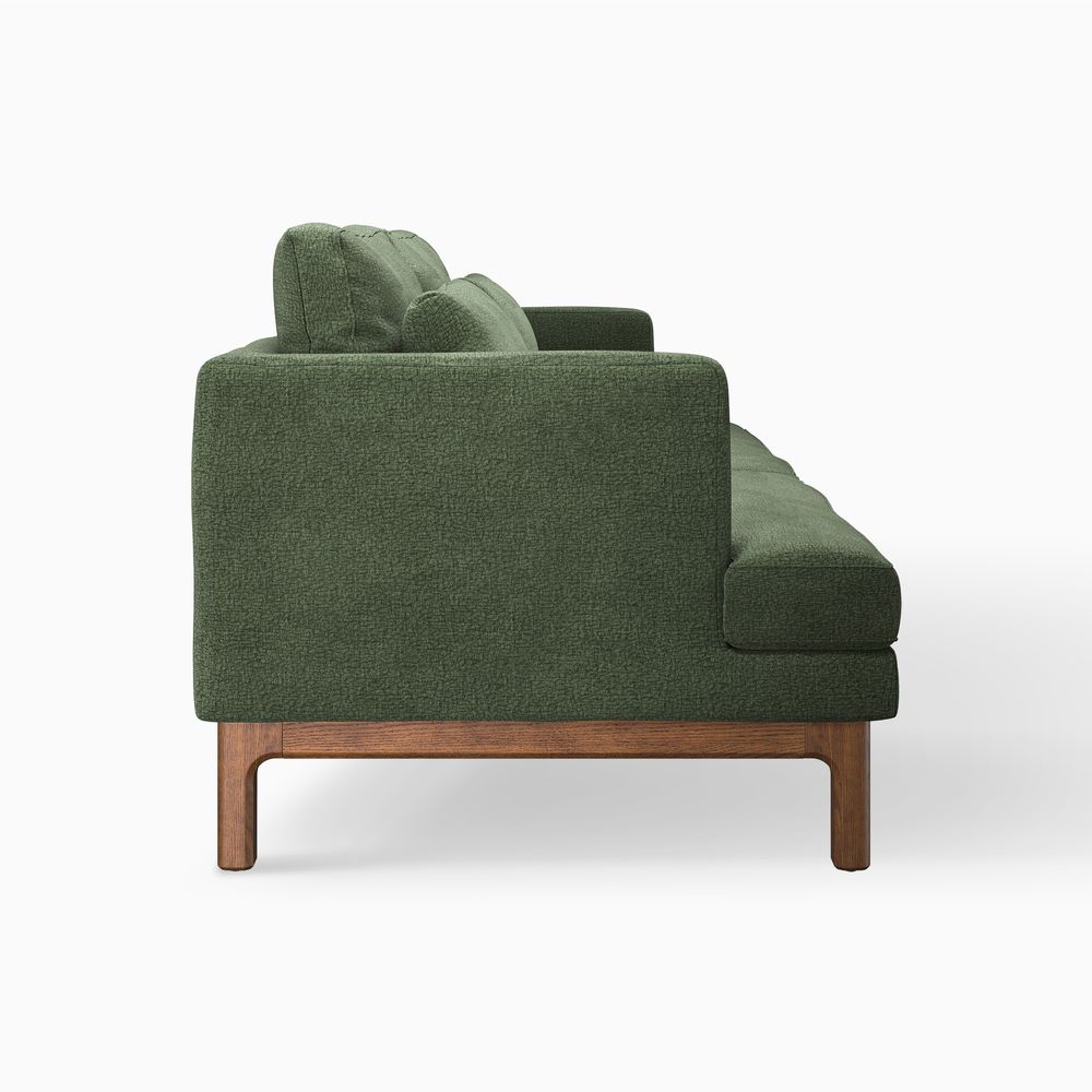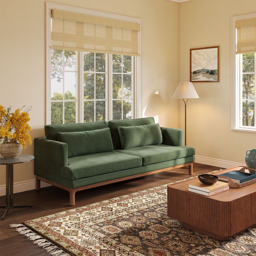Nori is defined by clean architectural lines, pairing a slim upright frame with generously deep seating. Elevated back cushions enhance support while maintaining a relaxed, modern presence. A raised wood base with softly curved detailing lightens the silhouette and brings warmth to the piece, balancing precision with comfort.