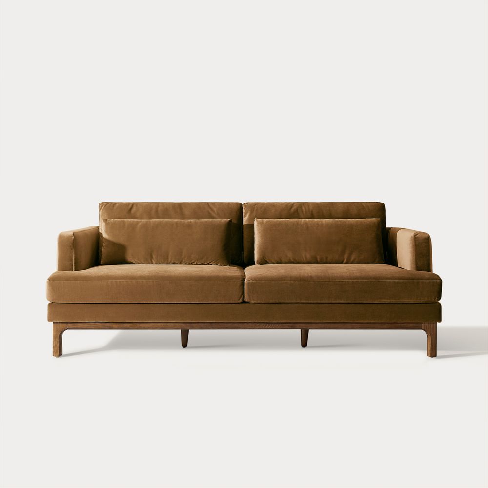 Nori is defined by clean architectural lines, pairing a slim upright frame with generously deep seating. Elevated back cushions enhance support while maintaining a relaxed, modern presence. A raised wood base with softly curved detailing lightens the silhouette and brings warmth to the piece, balancing precision with comfort.