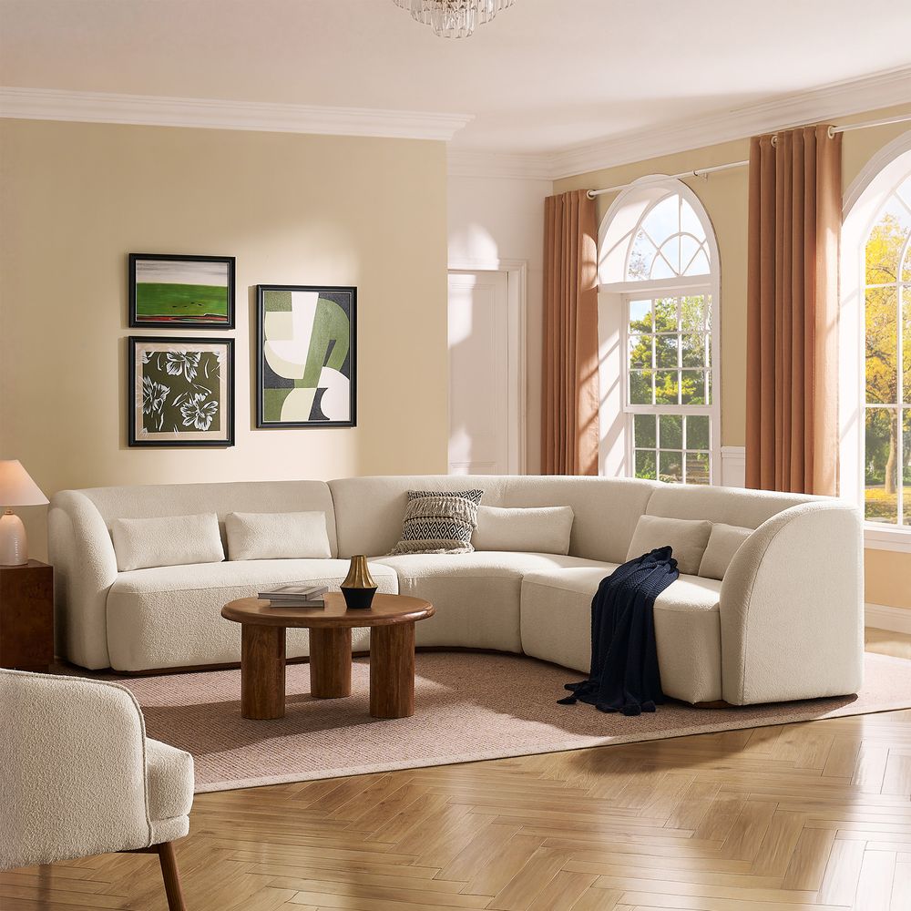 Solid ash wood and plywood frame.Bouclé fabric with spill-resistant and gives it a super soft handfeel.Seat cushions have fiber-wrapped, high-resiliency polyurethane foam cores.Sinuous spring suspension with reinforced elastic webbing.The upholstery on the sofa adds soft padding for cozy, stylish seating surfaces.5 throw pillows are included.Included sectional connectors ensure that components are secured tightly together, lift upward to release.Items purchased at different times may not match due to different dye lots, also color perception can vary by lighting and devices.