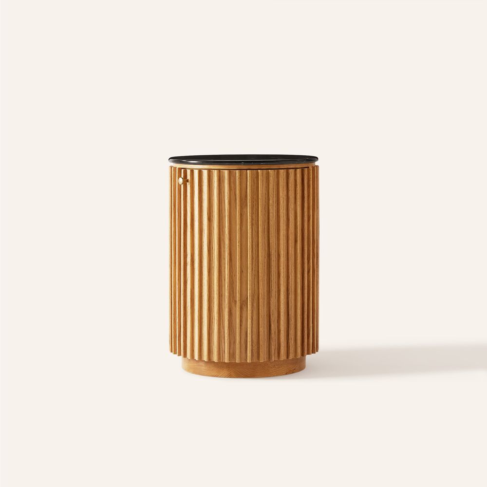 Featuring vertical fluted detailing on a rounded silhouette, this piece highlights warm wood tones and textured depth. An engineered stone top with subtle veining adds a refined contrast, creating a functional yet sculptural accent for modern spaces.