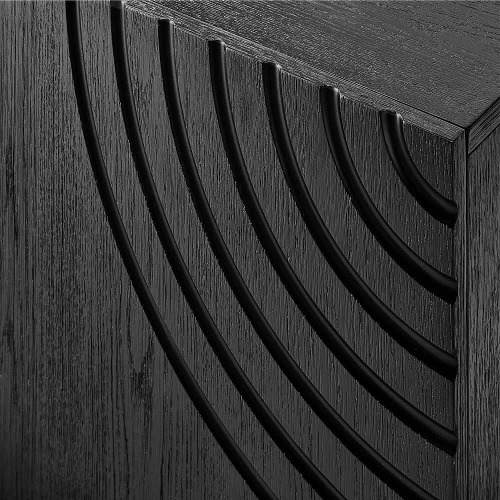Pascal media console features rich, dark-stained oak veneer highlighting the natural wood grain. Its door panel has smooth, semi-circular grooves forming a soft wave pattern, while sturdy, block-style legs with rounded edges provide a grounded feel. With simple lines and thoughtful details, it adds warmth and style to any room.