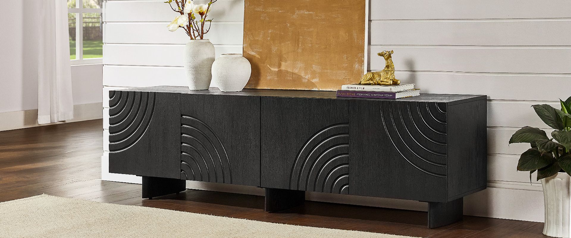 Crafted of American solid oak and engineered wood with oak veneers.All wood is kiln-dried for added durability.Solid wood blocks are used at structural joints for reinforcement.Introduces visual richness and an artistic touch through the carved design.Designed for TVs up to 85", 1 cord cutout in back panel for cable management.Color perception may vary due to wood characteristics, lighting, and devices. Wood grain variation is expected, as each is unique.