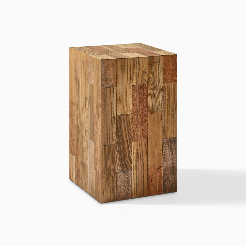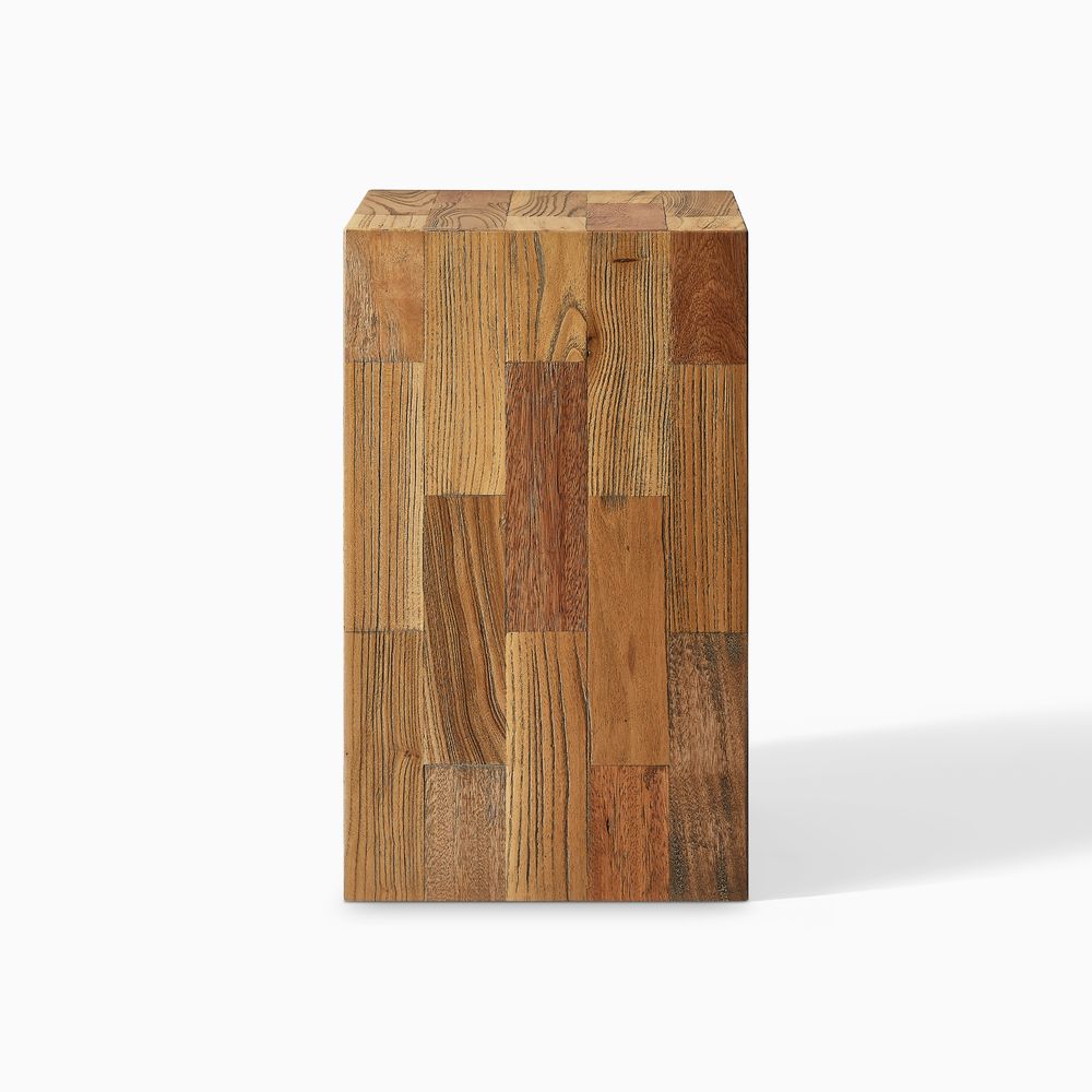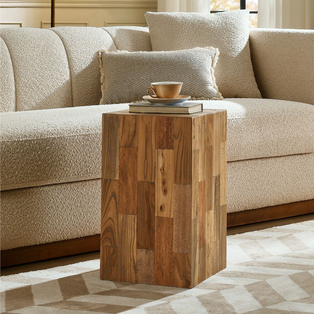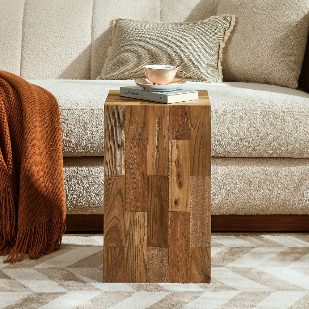 Meticulously assembled from old elm blocks, Ole side table shares the unique organic swirls, knots, and tonal shifts, making each piece a conversation-starting work of art.
