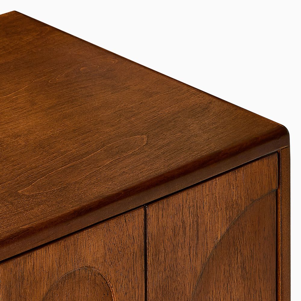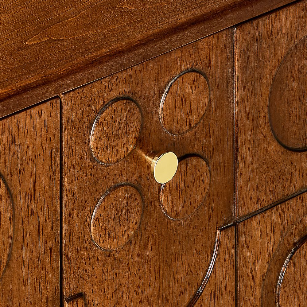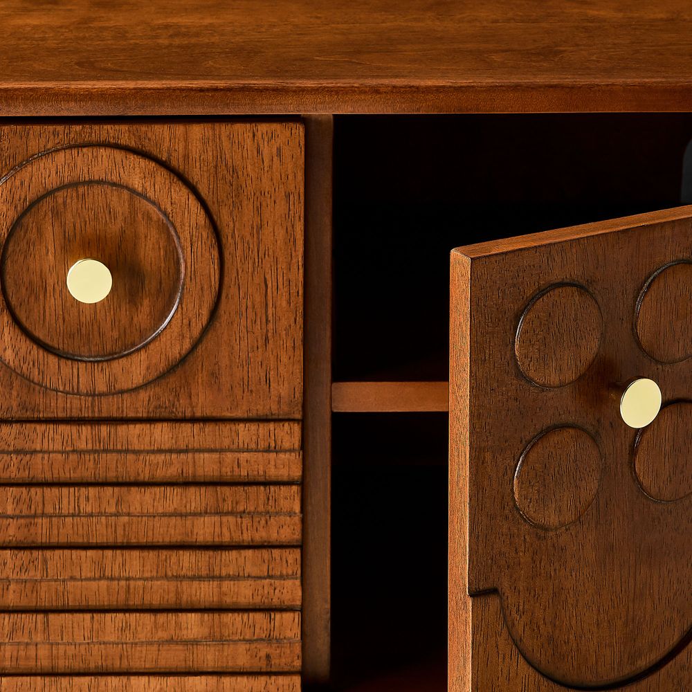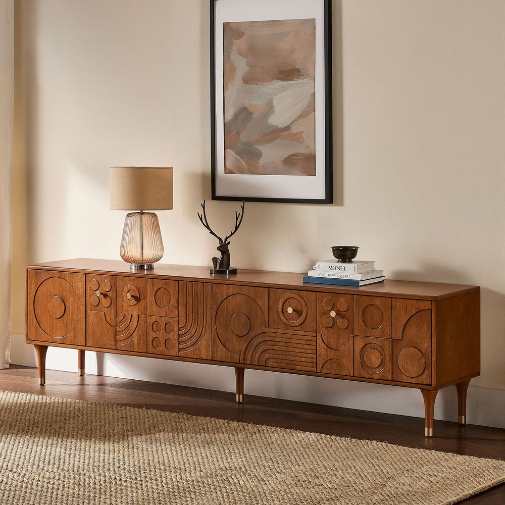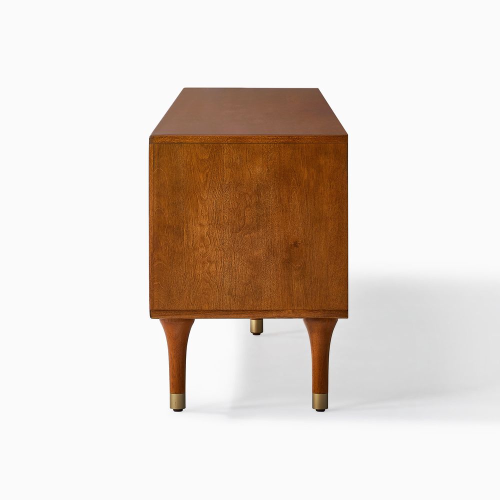 Ludovic media console blends modern form with retro charm. A warm wood finish and sculpted 3D facade create striking texture and depth, while thoughtfully placed cabinets offer discreet storage. Elevated on gold-tipped tapered legs, it brings timeless sophistication to refined living spaces.
