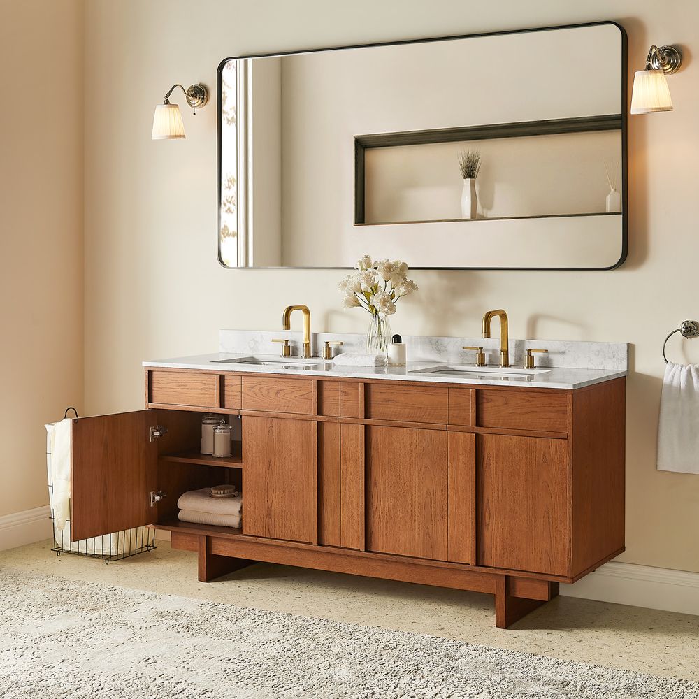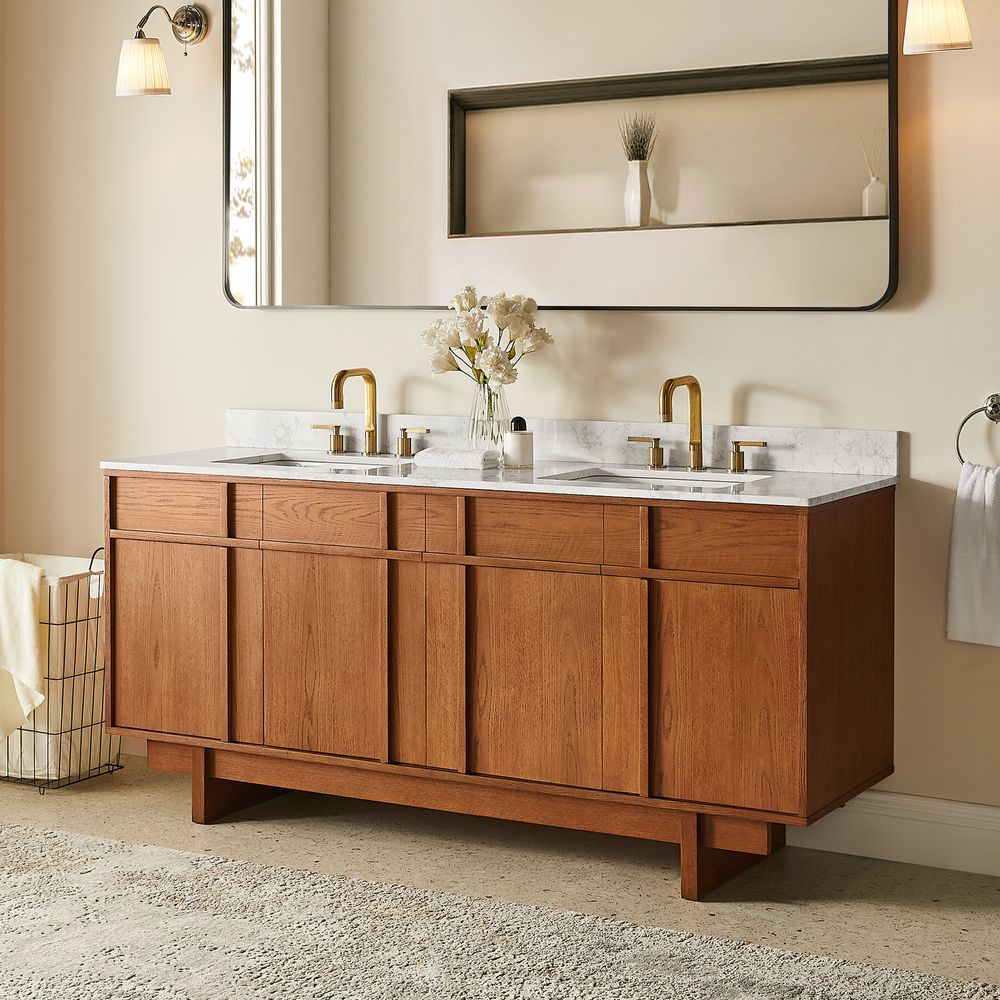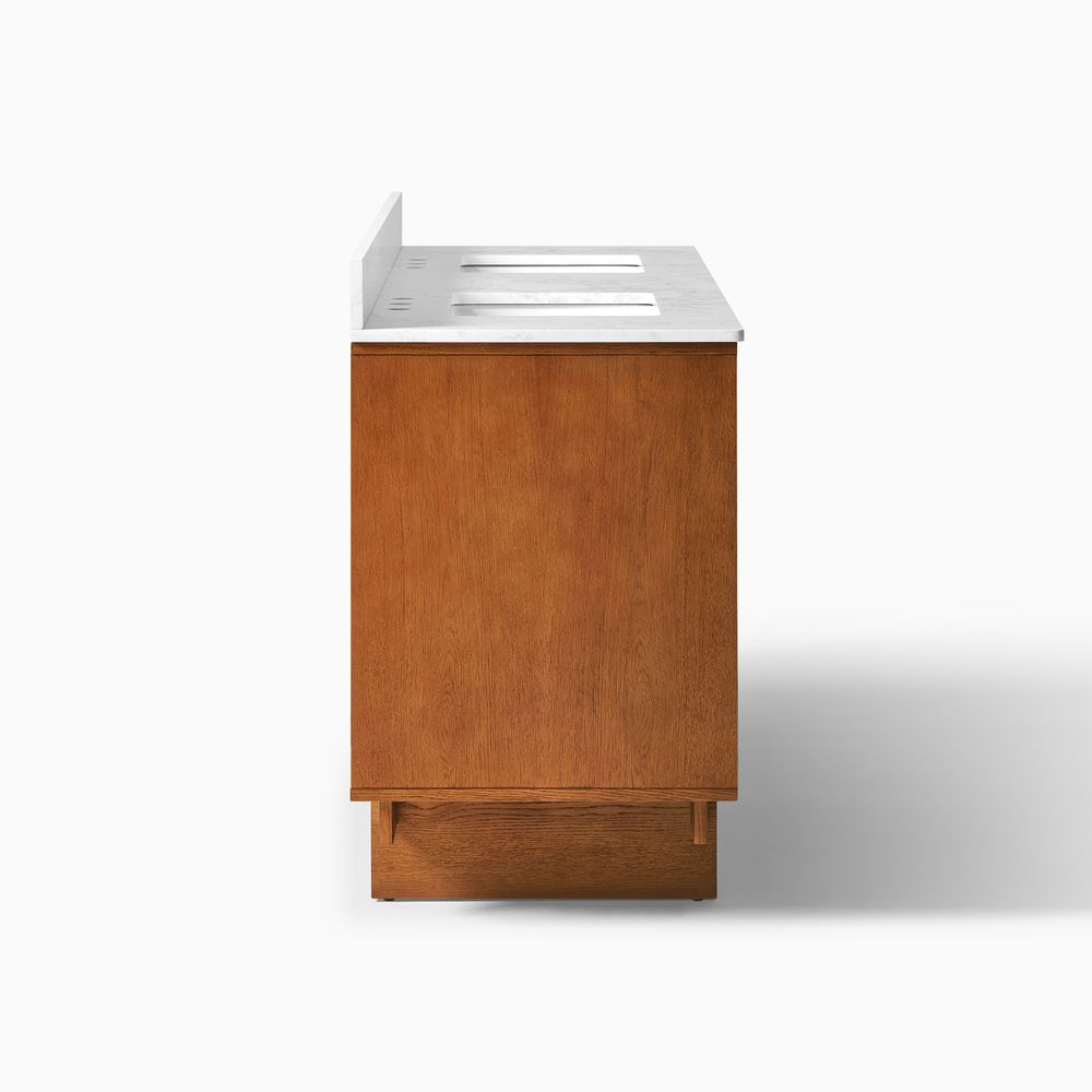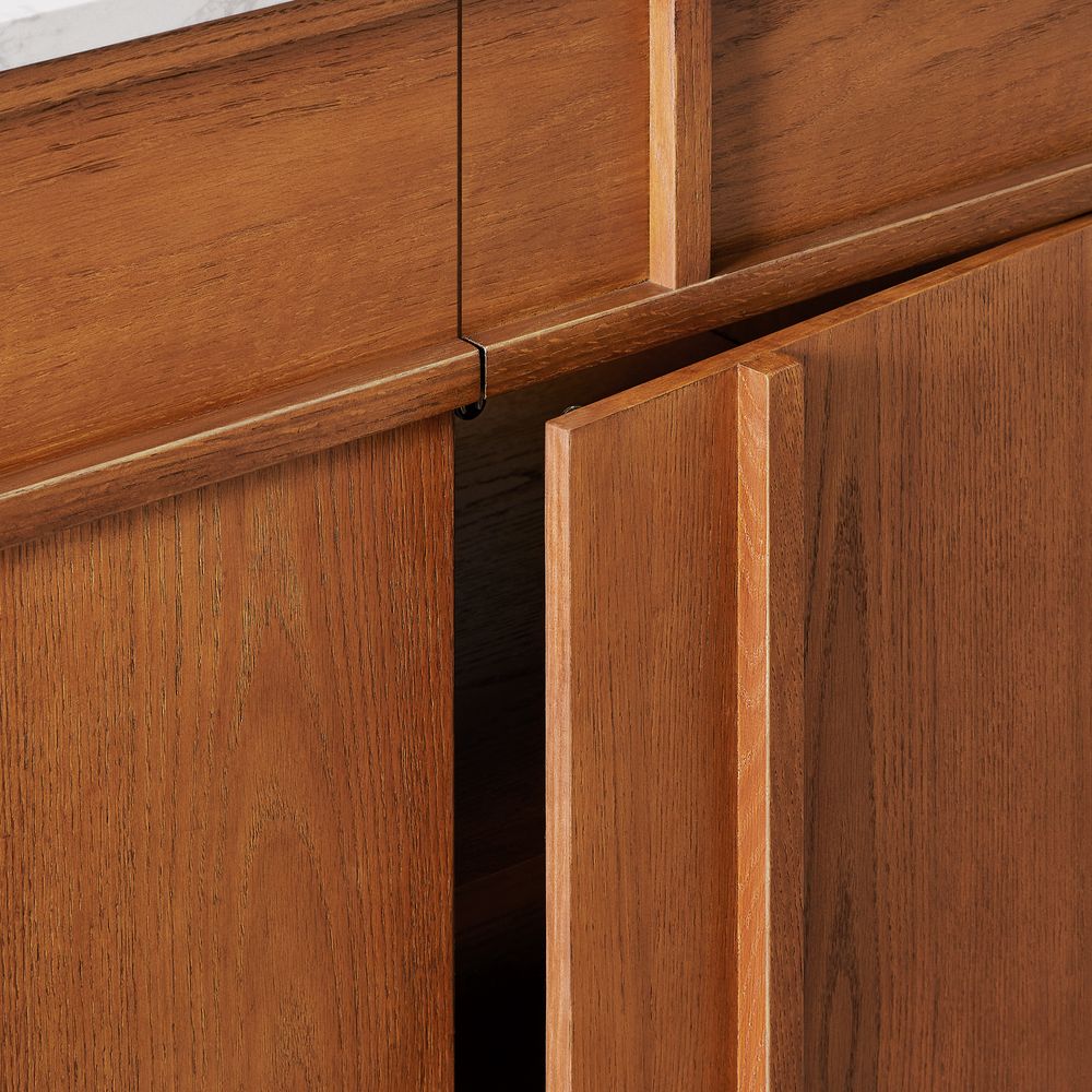 Crafted of cultured marble, American solid oak, and plywood with oak veneers.Countertop and backsplash are honed and sealed for a satin finish with deep veining and natural color contrasts.Finish is achieved through multistep process in which wood is wire brushed to highlight its rich grain.Wood glazing adds visual interest with greater depth and layering and enhances coloring.All wood is kiln-dried for added durability.Solid wood blocks are used at structural joints for reinforcement.Pop-up cabinet doors, seamlessly controlled at your fingertips.Color perception may vary due to wood characteristics, lighting, and devices. Wood grain variation is expected, as each is unique.Variation in the veining of stone is to be expected, as each piece will be unique.