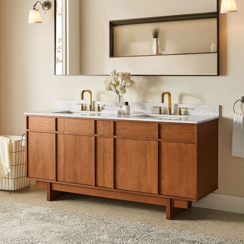 Crafted of engineered stone, American solid oak, and plywood with oak veneers.Countertop and backsplash are honed and sealed for a satin finish with deep veining and natural color contrasts.Finish is achieved through multistep process in which wood is wire brushed to highlight its rich grain.Wood glazing adds visual interest with greater depth and layering and enhances coloring.All wood is kiln-dried for added durability.Solid wood blocks are used at structural joints for reinforcement.Pop-up cabinet doors, seamlessly controlled at your fingertips.Color perception may vary due to wood characteristics, lighting, and devices. Wood grain variation is expected, as each is unique.Variation in the veining of stone is to be expected, as each piece will be unique.