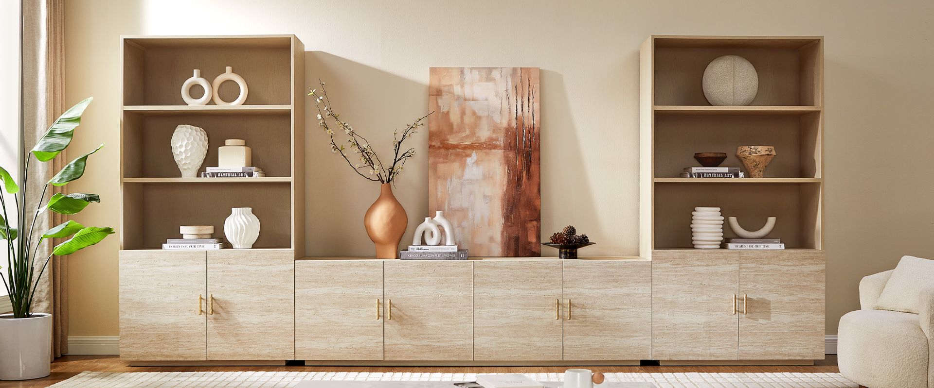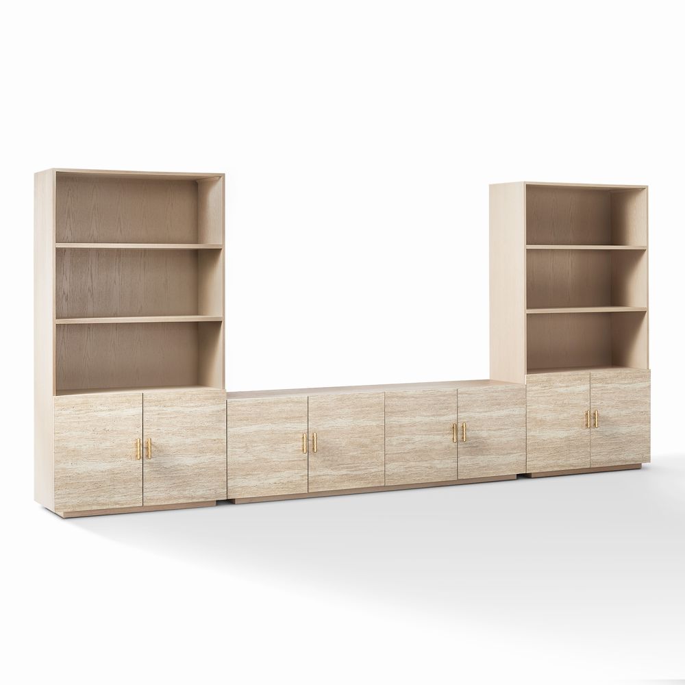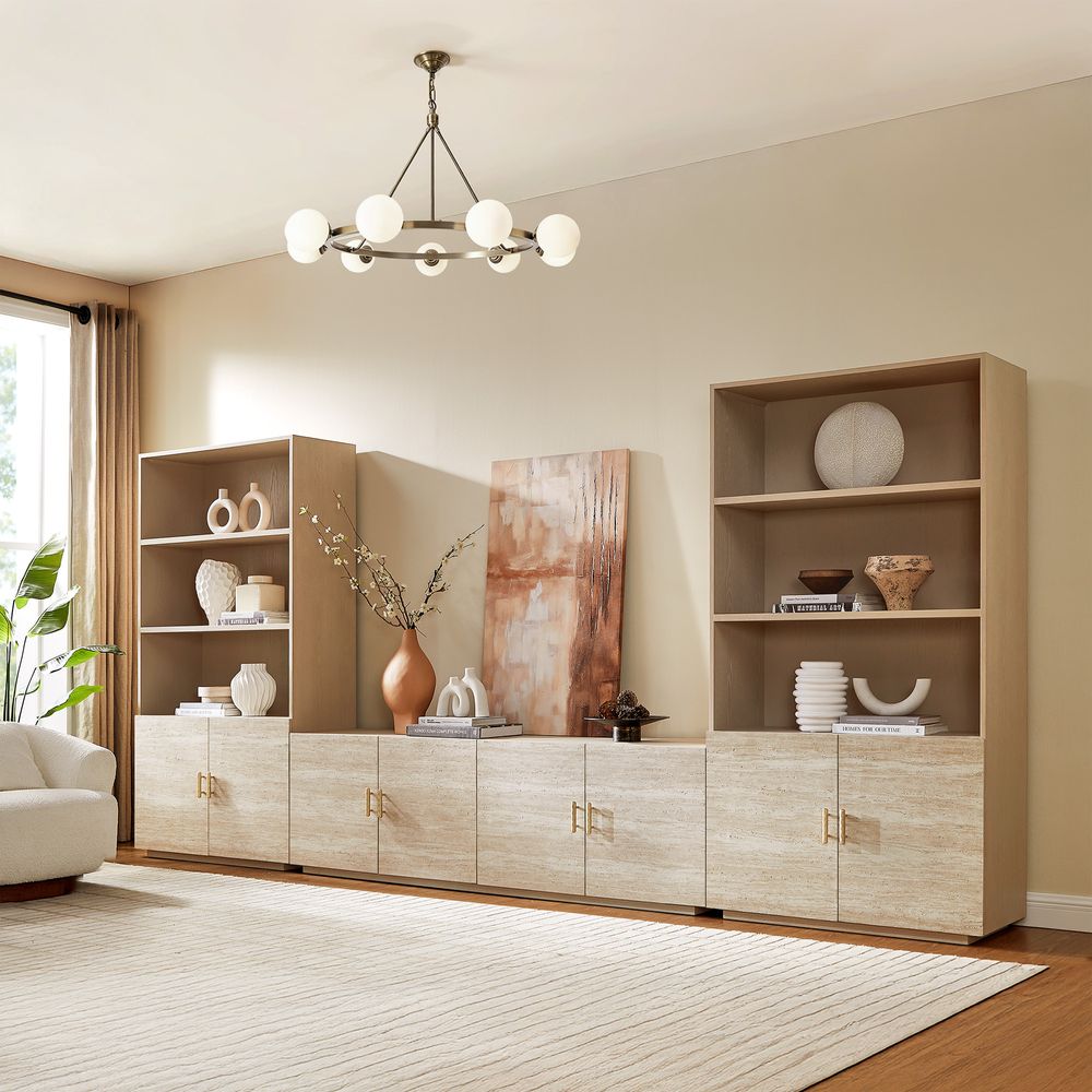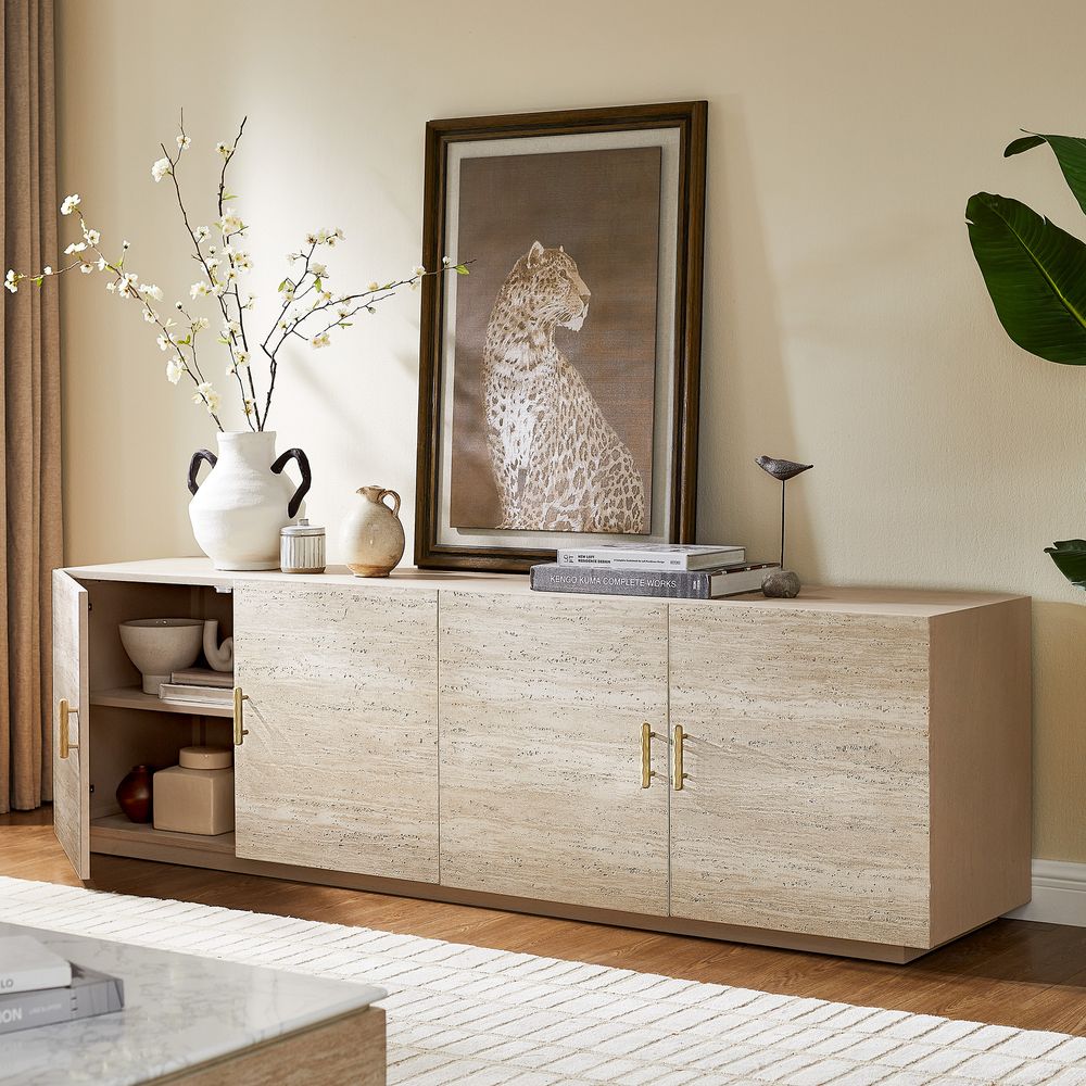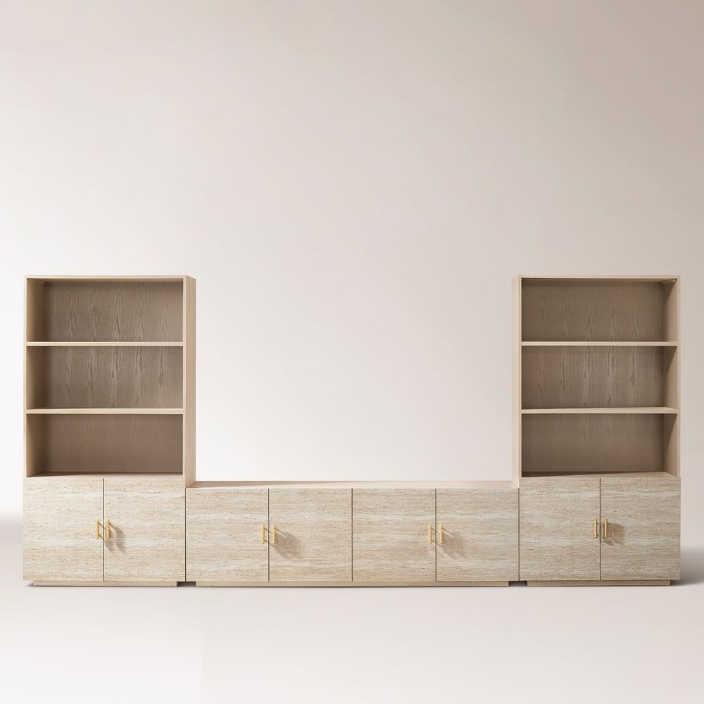 This entertainment center, centered on travertine-textured veneer, is accented with brass-toned hammered hardware that catches and shifts with the light, introducing a refined, unexpected twist to its rustic character.