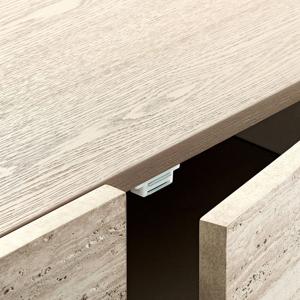Crafted of resin, solid wood and engineered wood with American oak veneers.All wood is kiln-dried for added durability.Finish is achieved through multistep process in which wood is wire brushed to highlight its rich grain.Wood glazing adds visual interest with greater depth and layering and enhances coloring.Travertine-inspired texture recreates the look and touch of aged stone.Solid wood blocks are used at structural joints for reinforcement.Media Console is designed for TVs up to 85", 4 cord cutouts in back panel for cable management.Cabinet is designed with 2 fixed shelves, 2 doors open to 2 adjustable shelves.Anti-tip kit hardware (included) is highly recommended to provide protection against tipping of furniture.Color perception may vary due to wood characteristics, lighting, and devices. Wood grain variation is expected, as each is unique.
