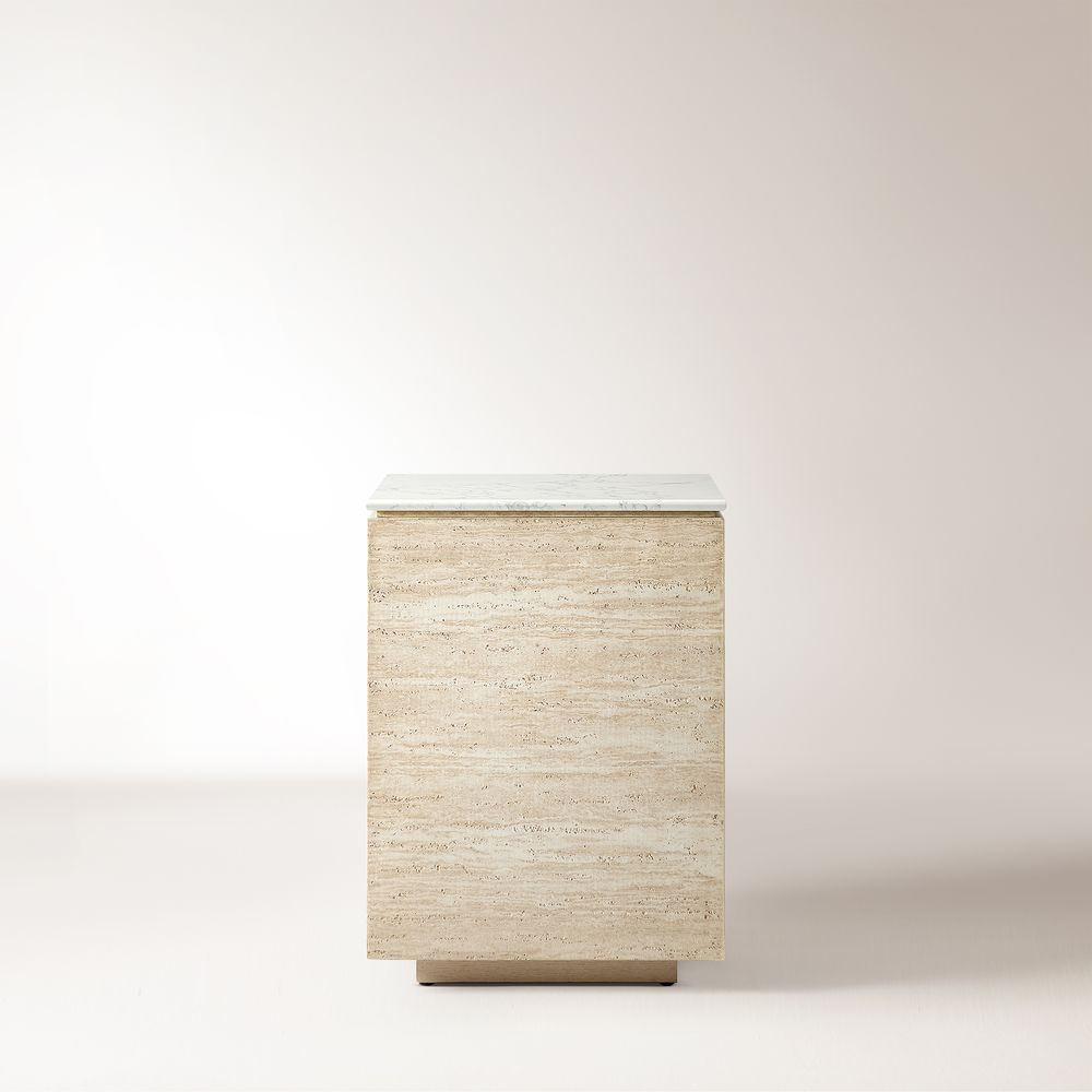 The table, with travertine-textured veneer at the center of its form, features a floating silhouette that brings layered depth and a sense of lightness. The engineered stone top, with its fluid veining, adds a gentle sensory contrast and quiet sophistication to the piece.