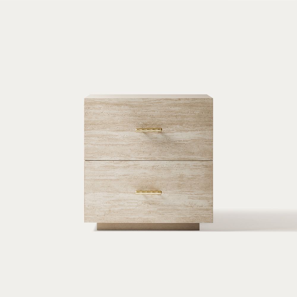 This nightstand, centered on travertine-textured veneer, is accented with brass-toned hammered hardware that catches and shifts with the light, introducing a refined, unexpected twist to its rustic character.