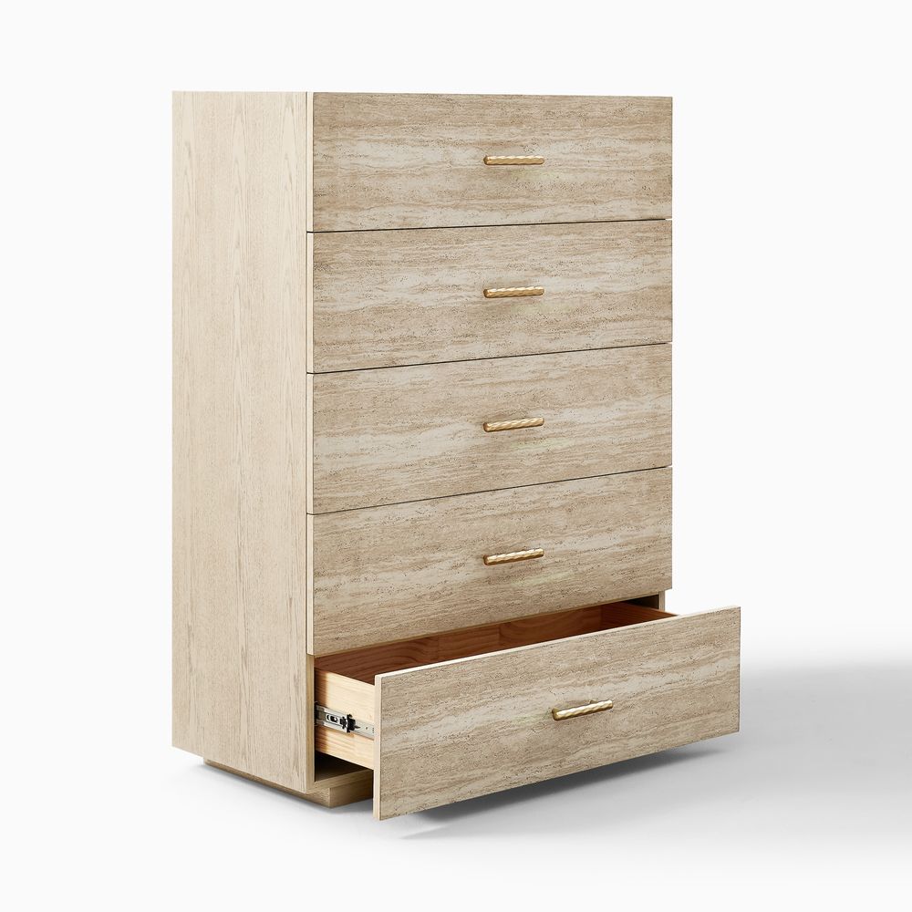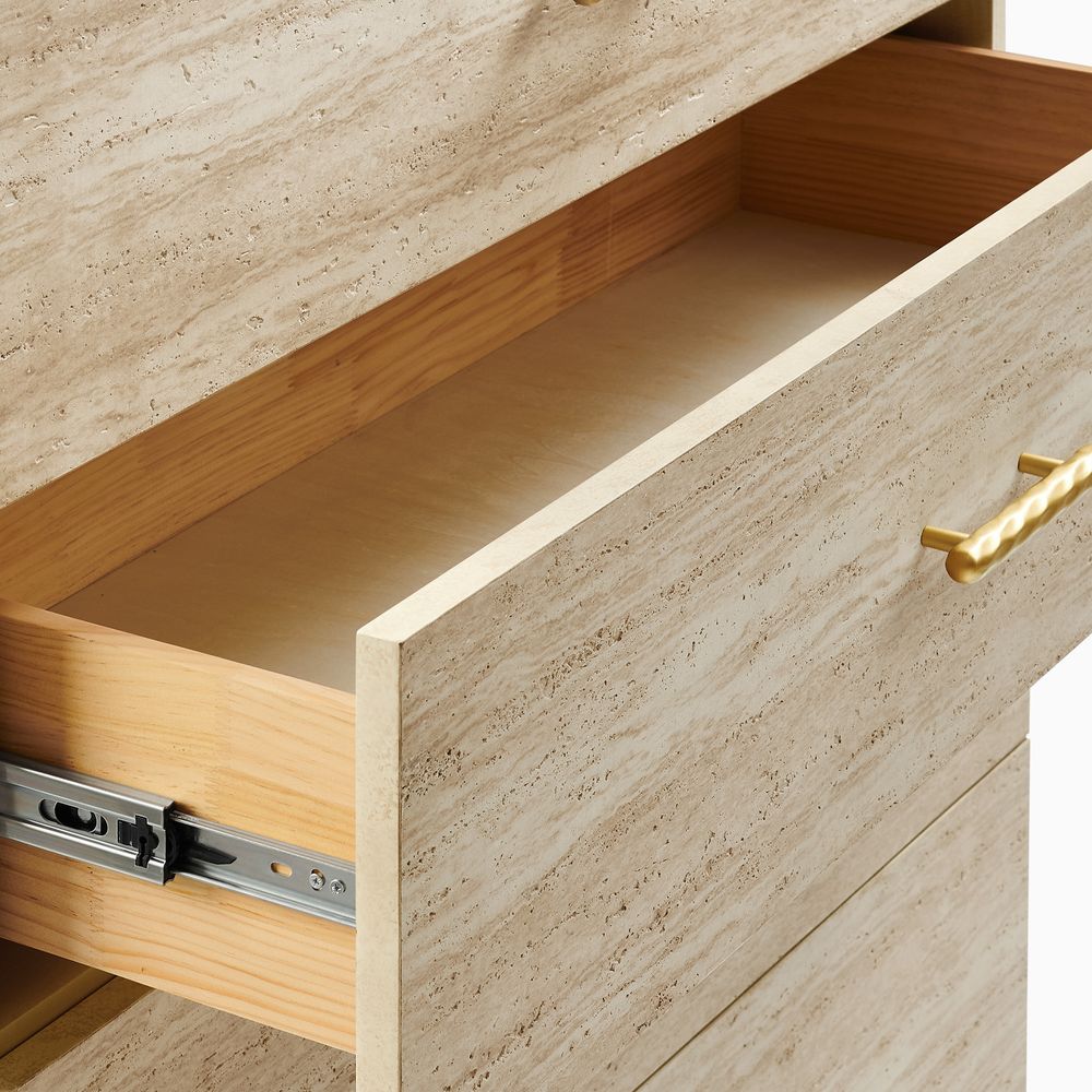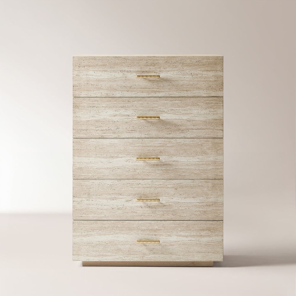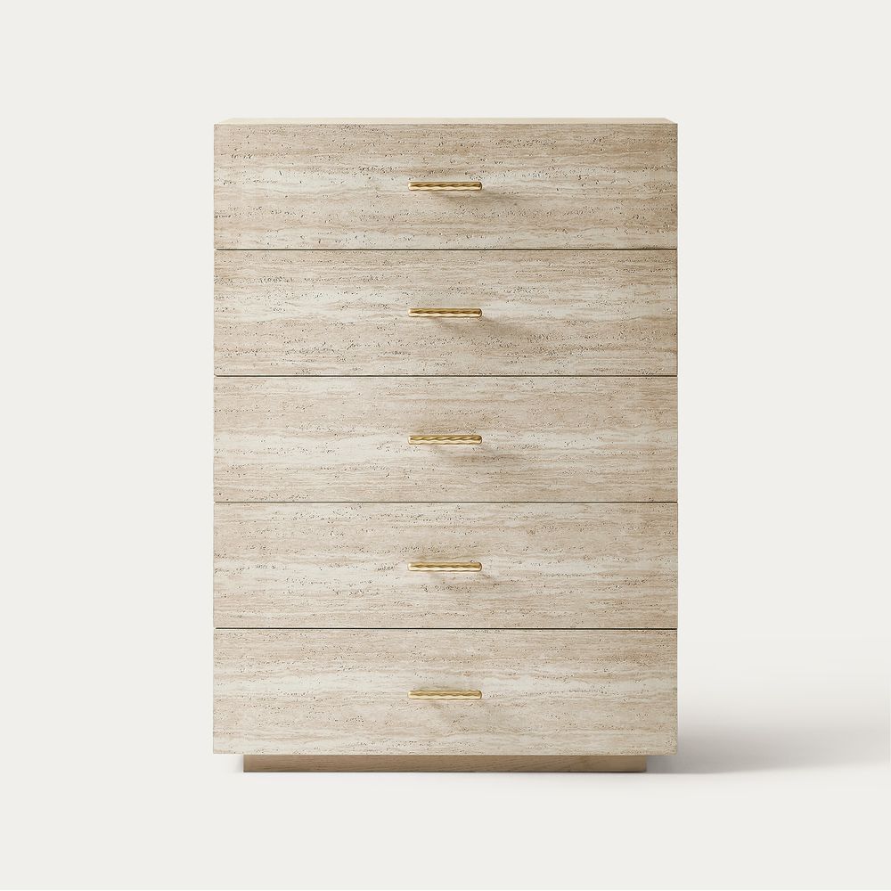 This dresser, centered on travertine-textured veneer, is accented with brass-toned hammered hardware that catches and shifts with the light, introducing a refined, unexpected twist to its rustic character.