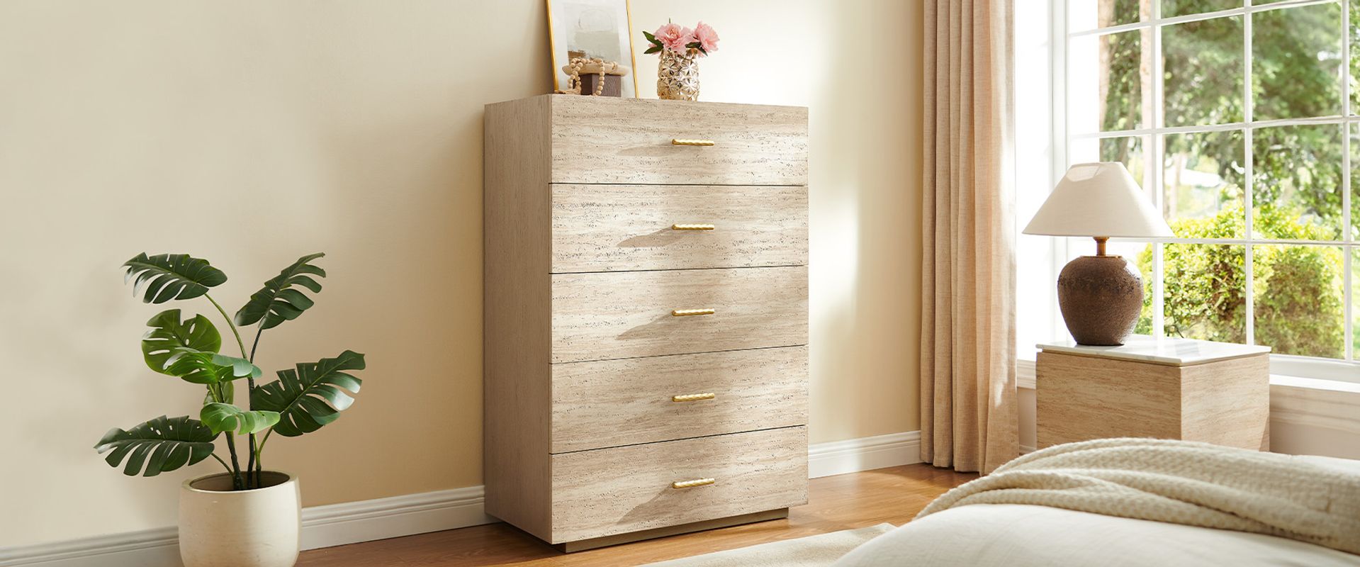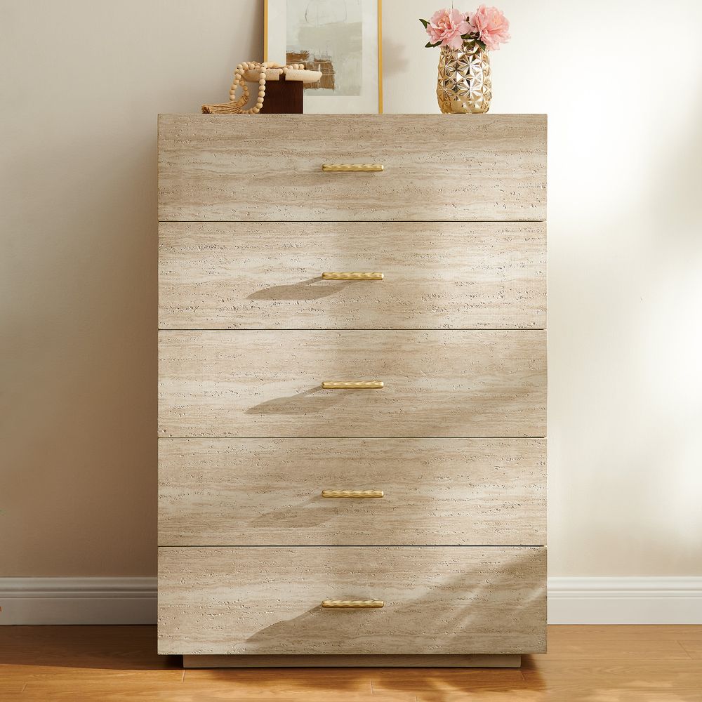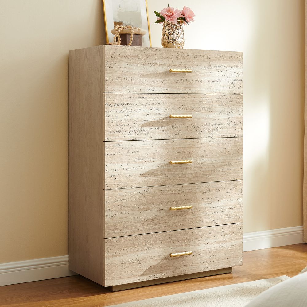 This dresser, centered on travertine-textured veneer, is accented with brass-toned hammered hardware that catches and shifts with the light, introducing a refined, unexpected twist to its rustic character.