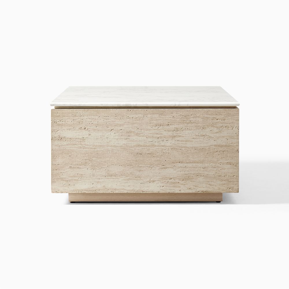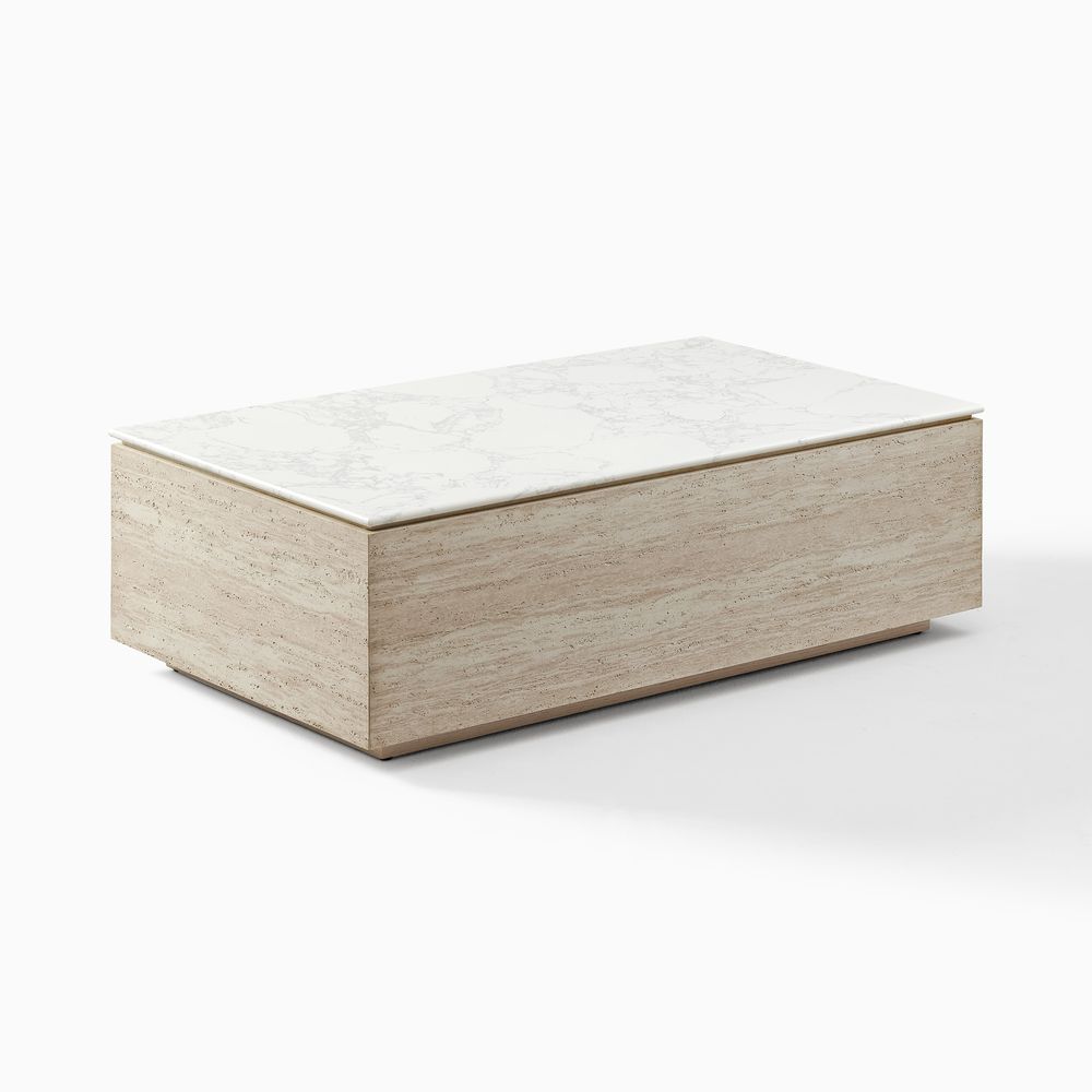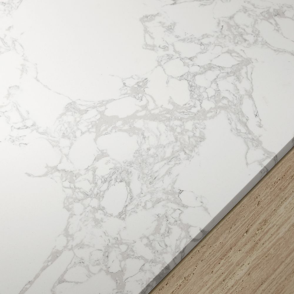 Crafted of cultured marble, resin, and plywood.Countertop are honed and sealed for a satin finish with deep veining and natural color contrasts.Travertine-inspired texture recreates the look and touch of aged stone.Solid wood blocks are used at structural joints for reinforcement.Color perception may vary due to lighting and devices.Variation in the veining of stone is to be expected, as each piece will be unique.