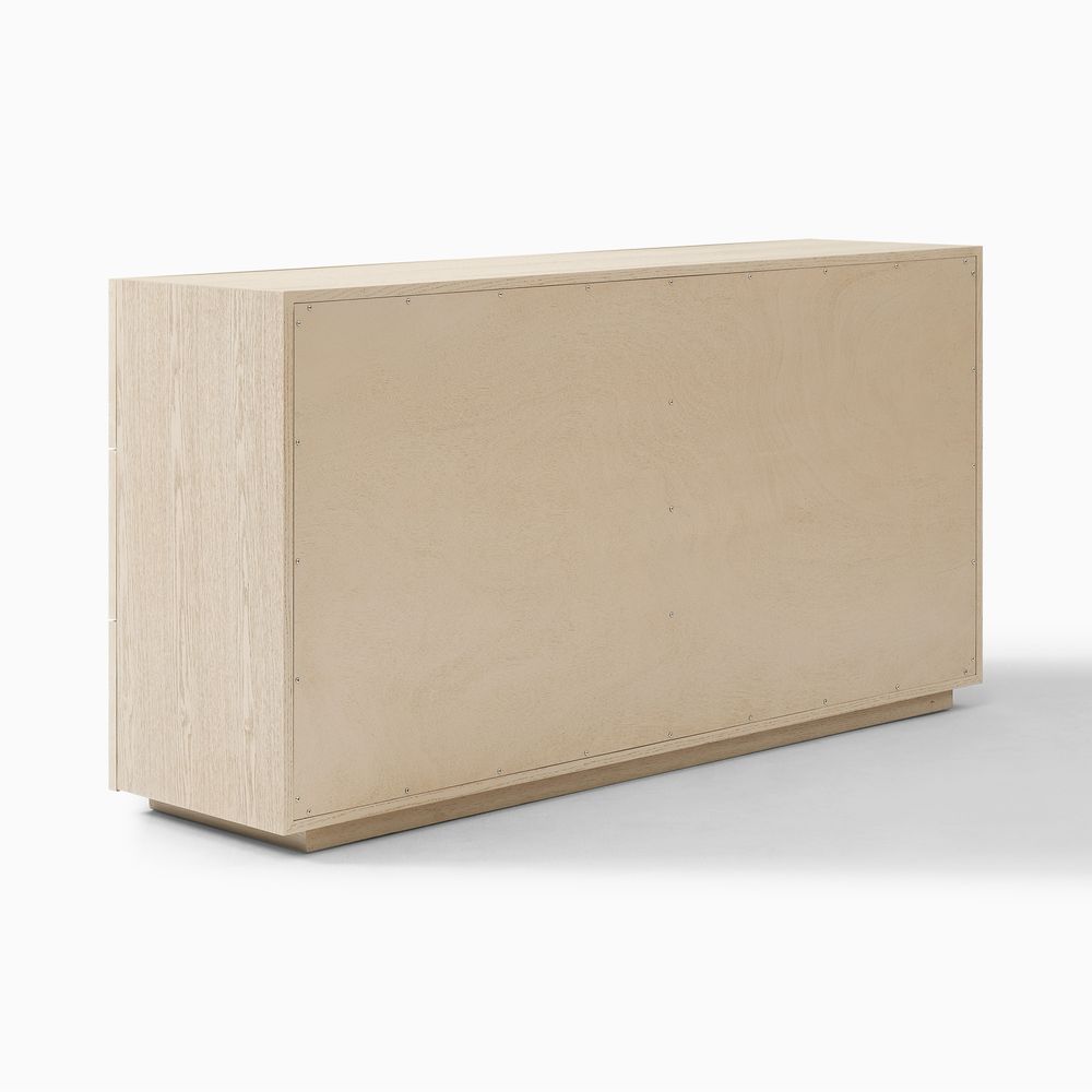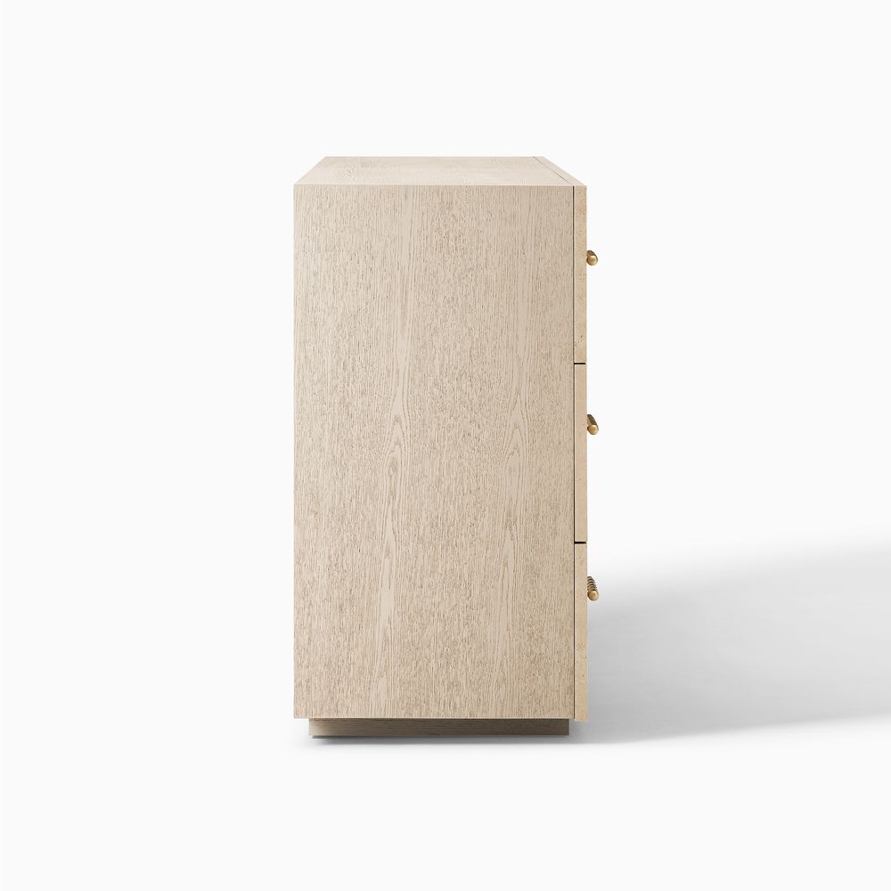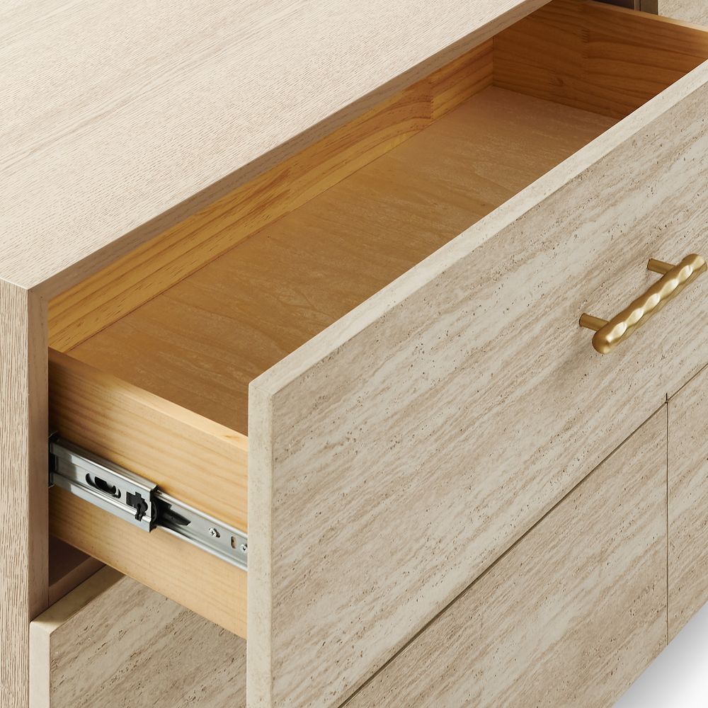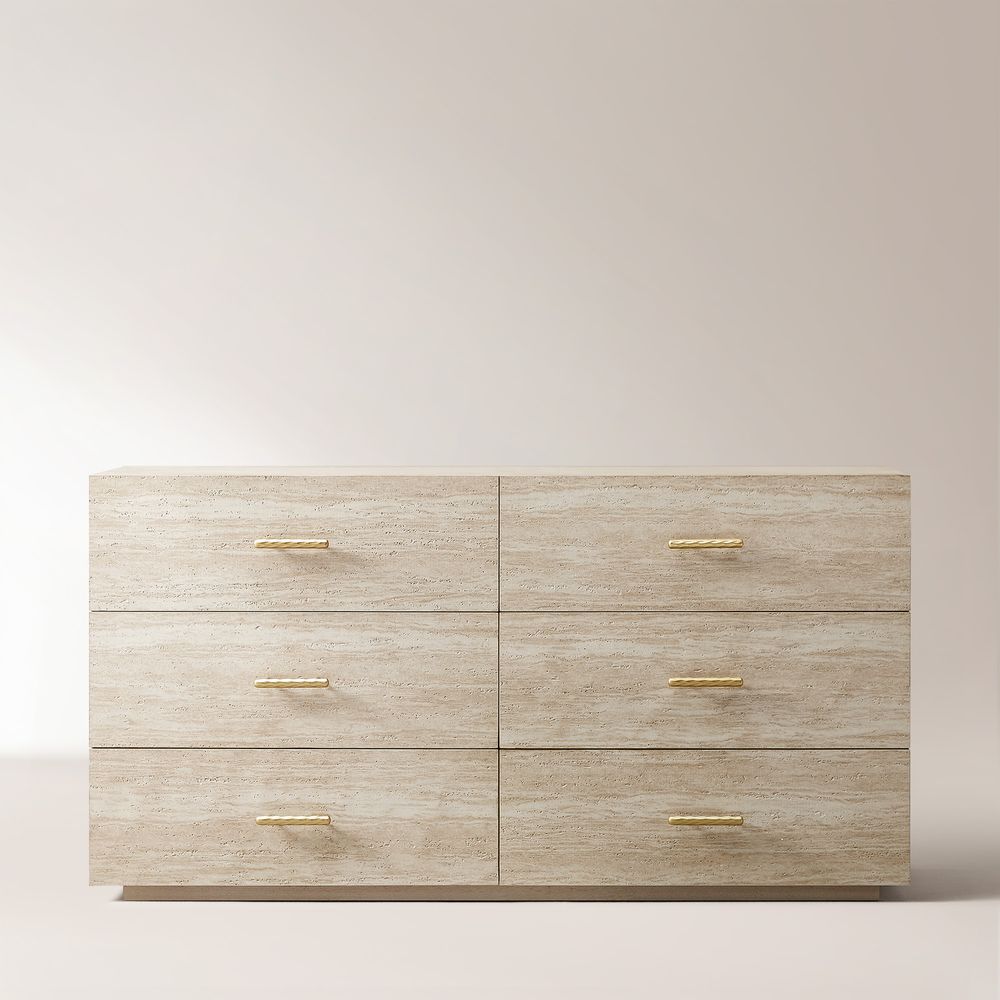 This dresser, centered on travertine-textured veneer, is accented with brass-toned hammered hardware that catches and shifts with the light, introducing a refined, unexpected twist to its rustic character.
