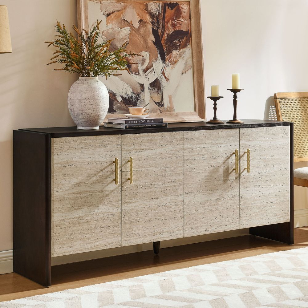 This sideboard, centered on travertine-textured veneer, features a dark wood grain frame that adds strong tonal contrast, and light brass-toned hammered hardware that adds refined details, making it a well-balanced piece with visual character without being overpowering.