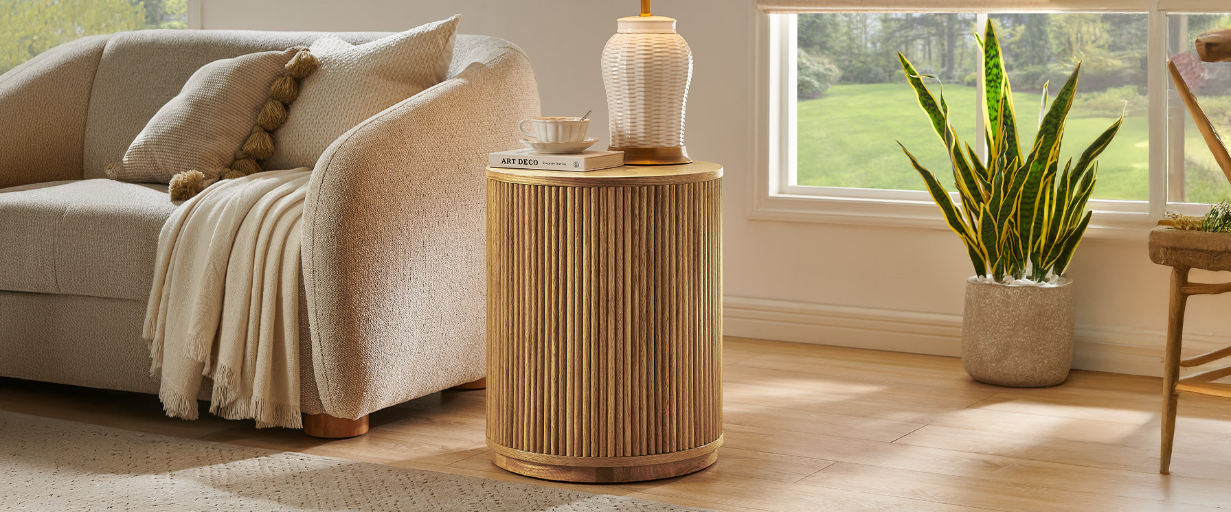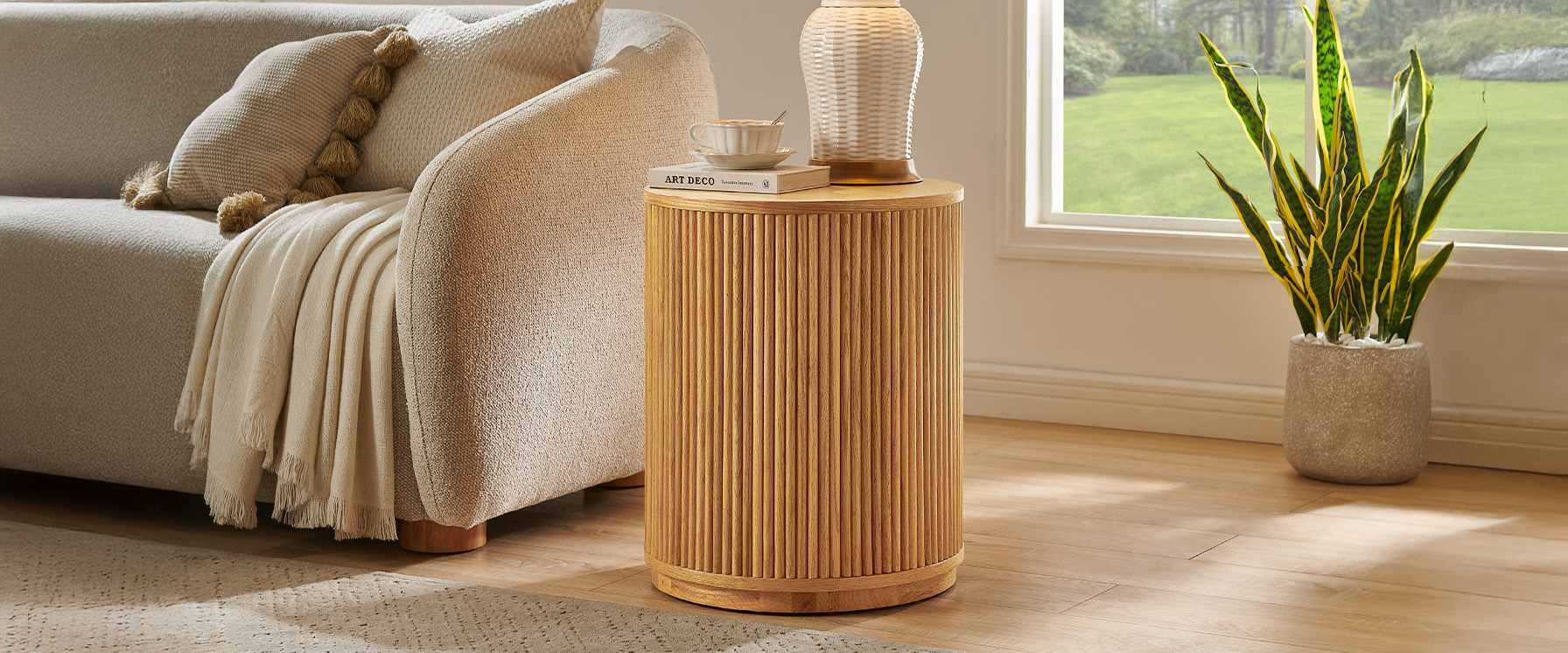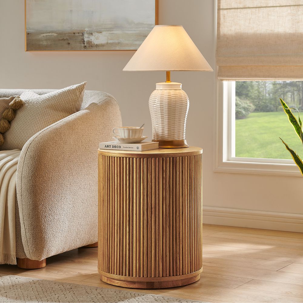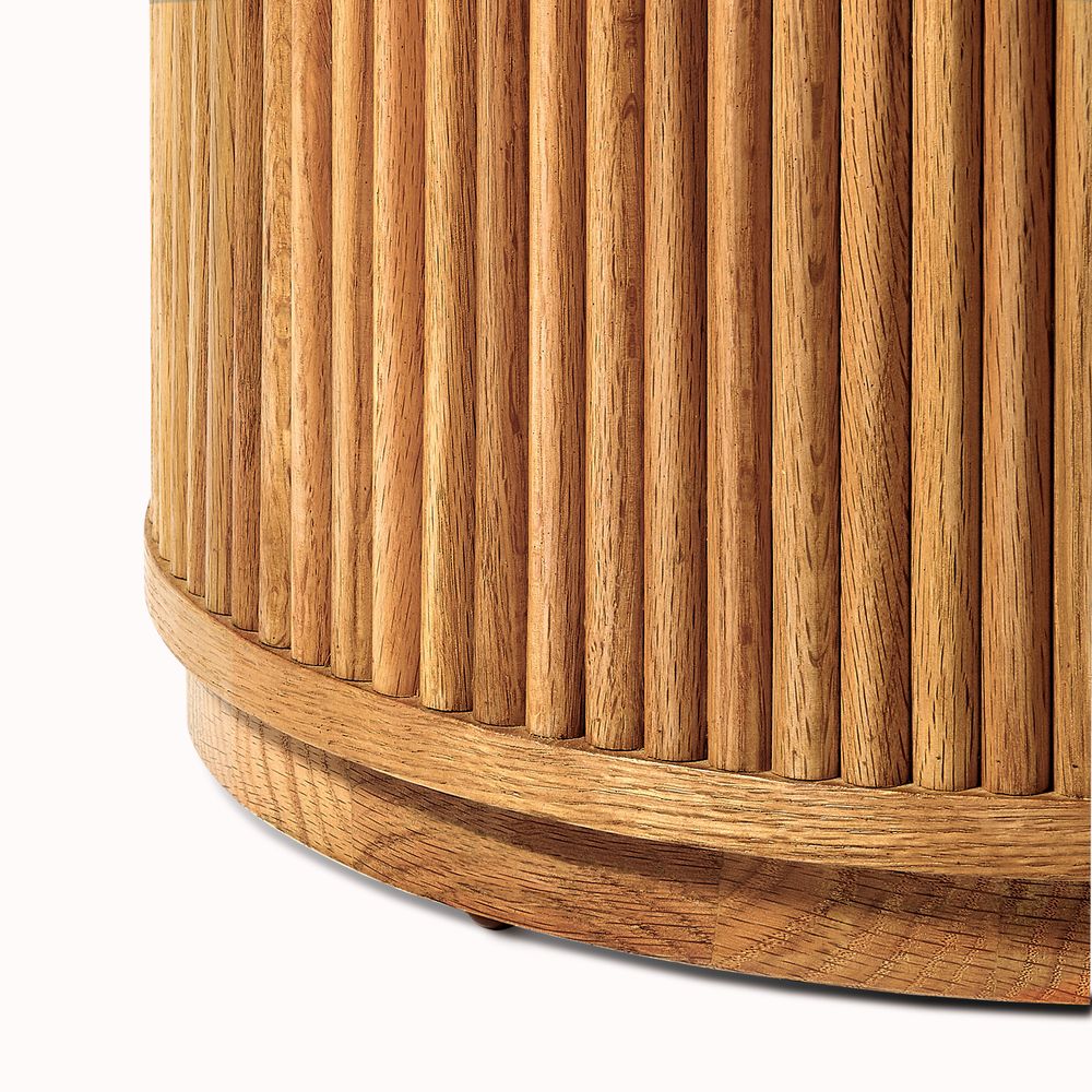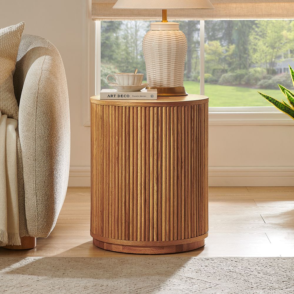 Crafted of American solid oak and engineered wood with oak veneers.All wood is kiln-dried for added durability.Solid wood fluting presents a natural texture.Blends mid-century minimalism with vertical stripe design.Color perception may vary due to wood characteristics, lighting, and devices. Wood grain variation is expected, as each is unique.