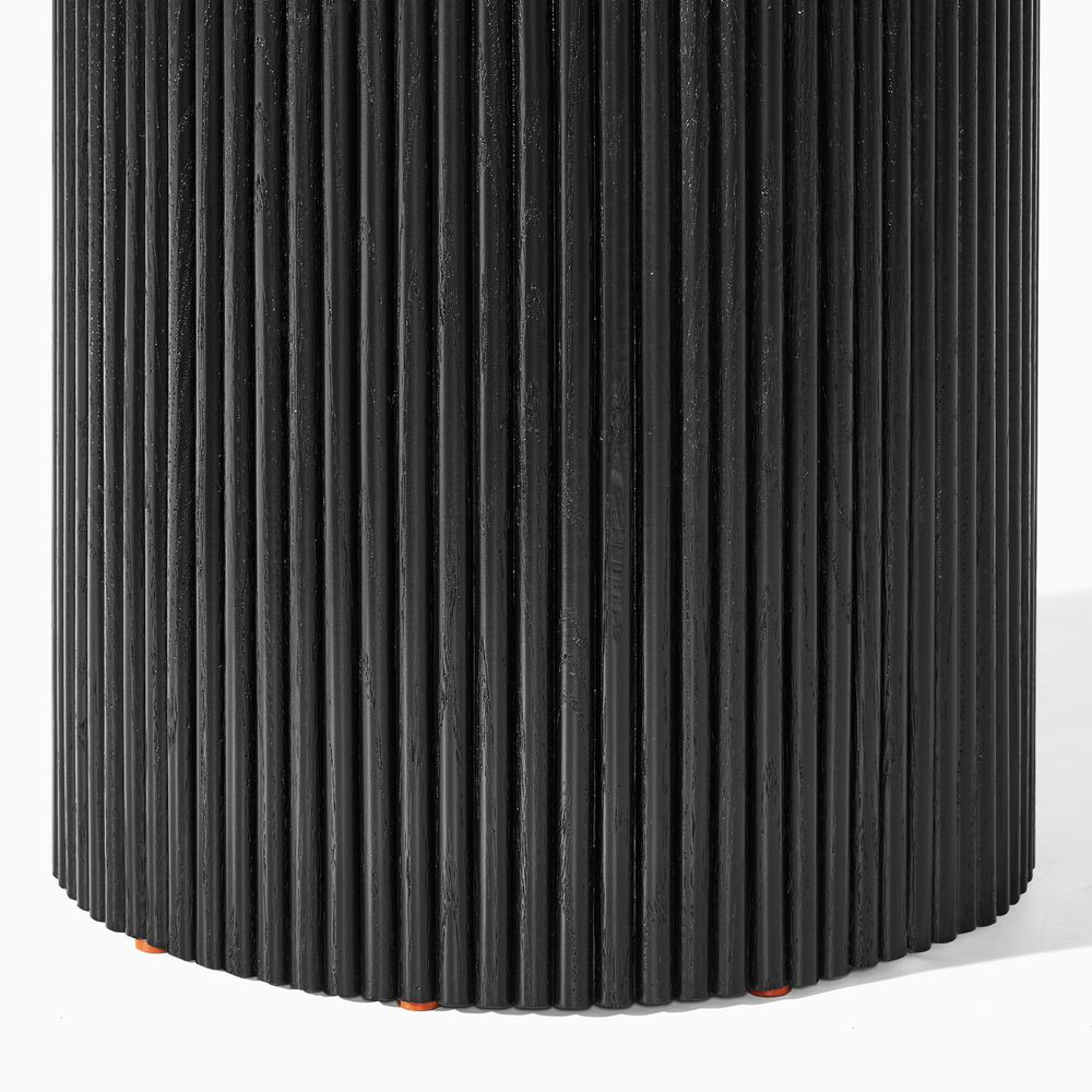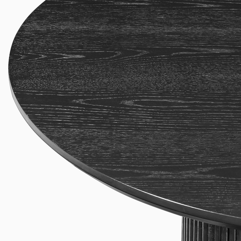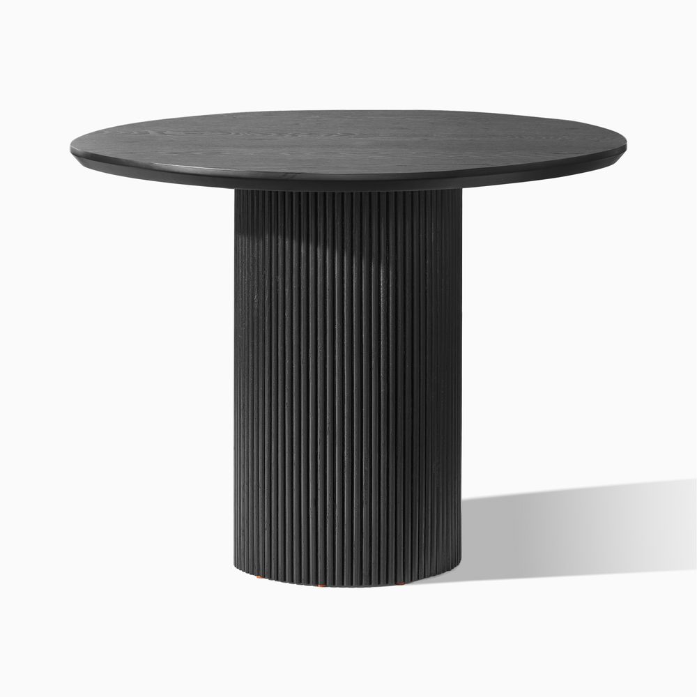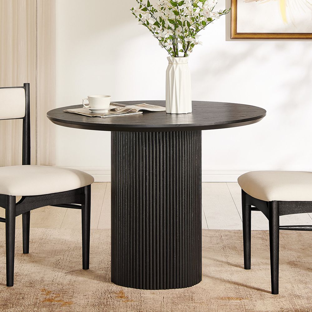 Crafted of American oak, plywood, and engineered wood with oak veneers.All wood is kiln-dried for added durability.Solid oak fluting presents a natural texture.Beveling angled edges for subtle charm.39" round table comfortably seats 2-4.Color perception may vary due to wood characteristics, lighting, and devices. Wood grain variation is expected; each is unique.