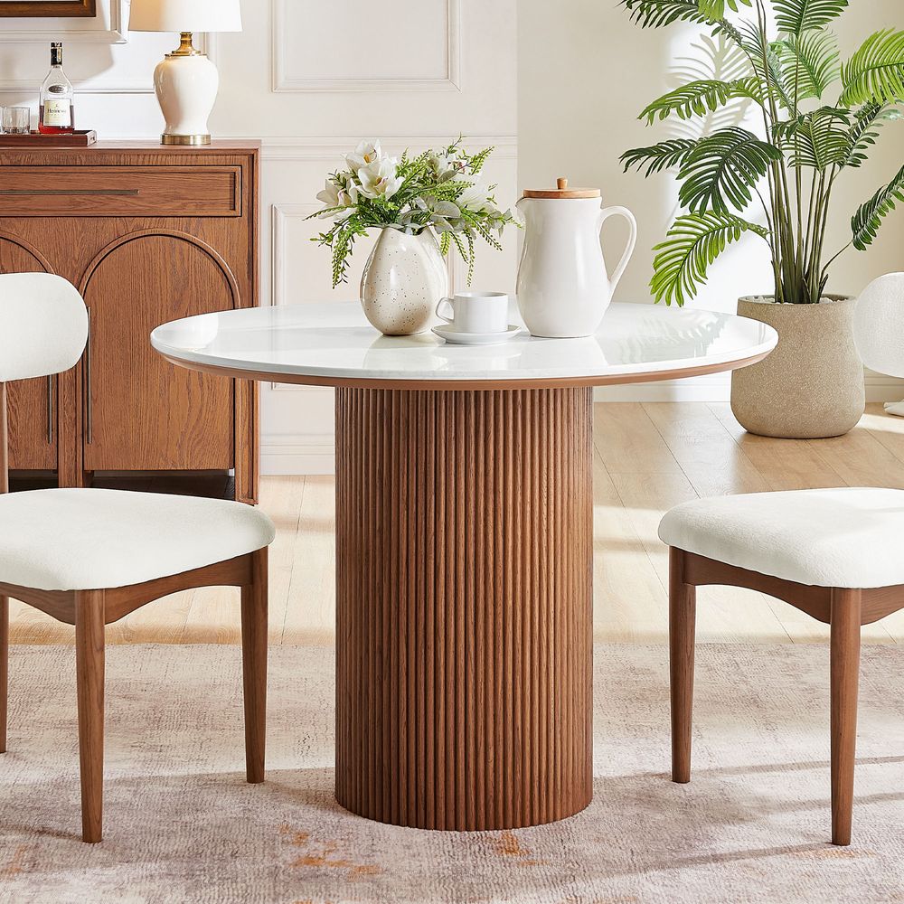 Crafted of American oak, engineered stone, plywood, and engineered wood.Tabletop is honed and sealed for a satin finish with deep veining and natural color contrasts.All wood is kiln-dried for added durability.Wood glazing adds visual interest with greater depth and layering and enhances coloring.Solid oak fluting presents a natural texture.Beveling angled edges for subtle charm.39" round table comfortably seats 2-4.Color perception may vary due to wood characteristics, lighting, and devices. Wood grain variation is expected; each is unique.Variation in the veining of stone is to be expected, as each piece will be unique.