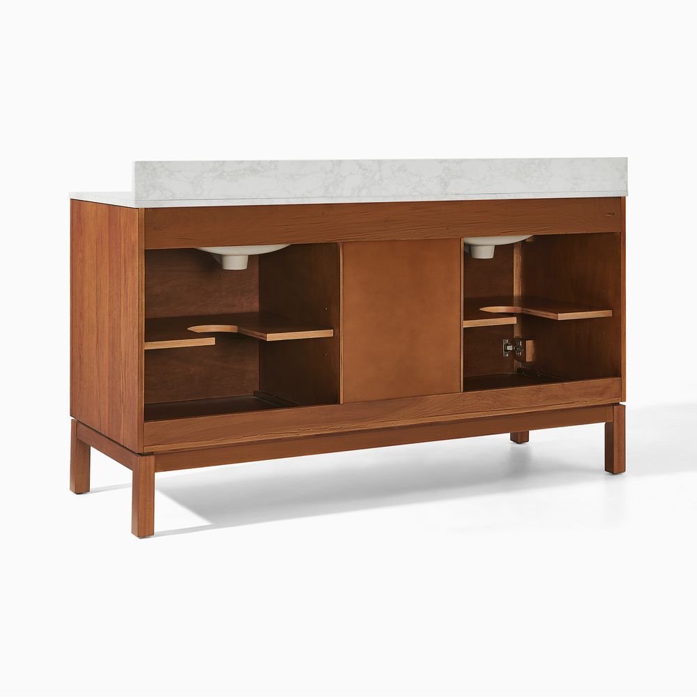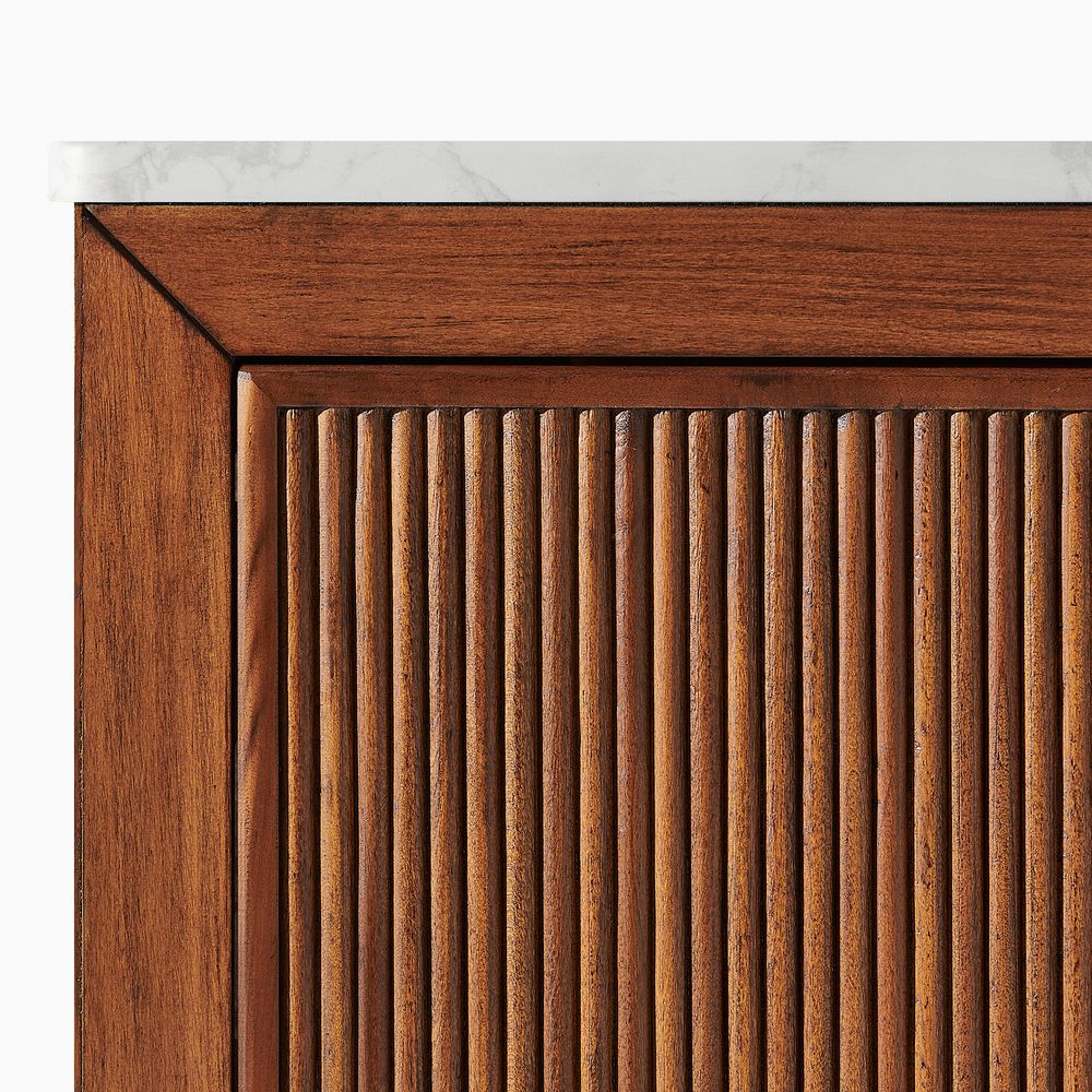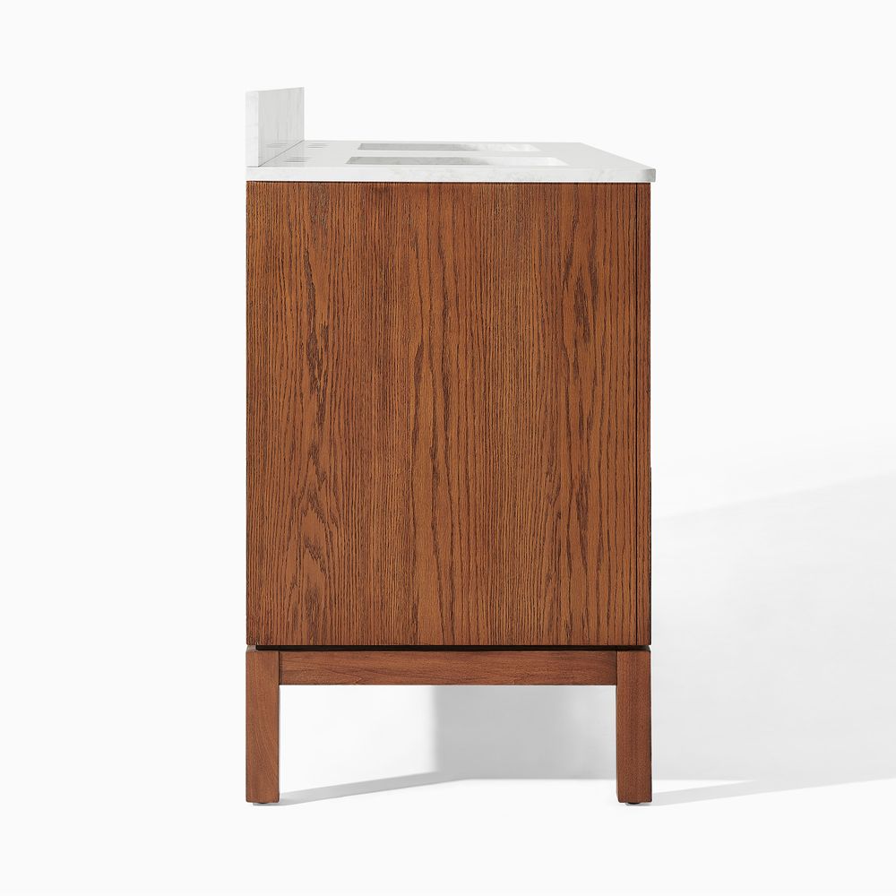 Crafted of cultured marble, solid wood, and plywood with oak veneers.Countertop and backsplash are honed and sealed for a satin finish with deep veining and natural color contrasts.All wood is kiln-dried for added durability.Drawers are crafted with precision dovetail joints for superior sturdiness and weight-bearing strength.Solid wood blocks are used at structural joints for reinforcement.Solid wood fluting presents a natural texture.Color perception may vary due to wood characteristics, lighting, and devices. Wood grain variation is expected, as each is unique.Variation in the veining of stone is to be expected, as each piece will be unique.